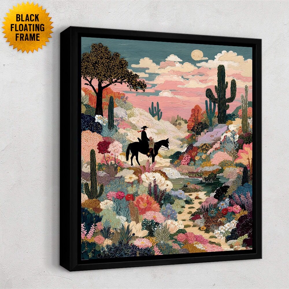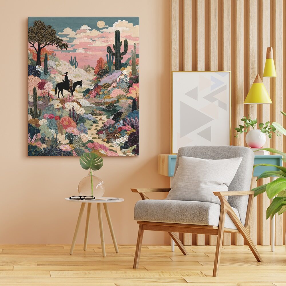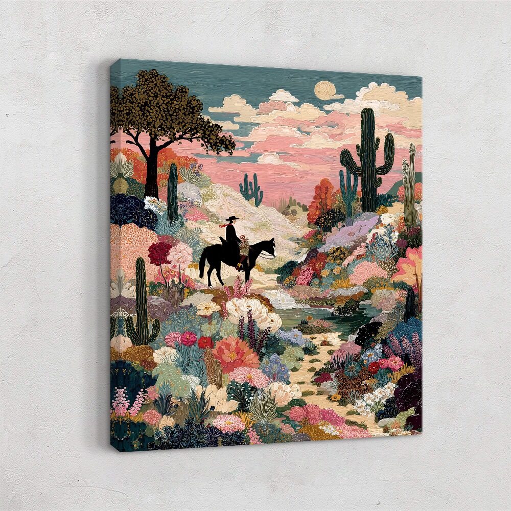 A lone rider on horseback overlooking a vibrant, flower-filled desert landscape with cacti under a pastel sky.