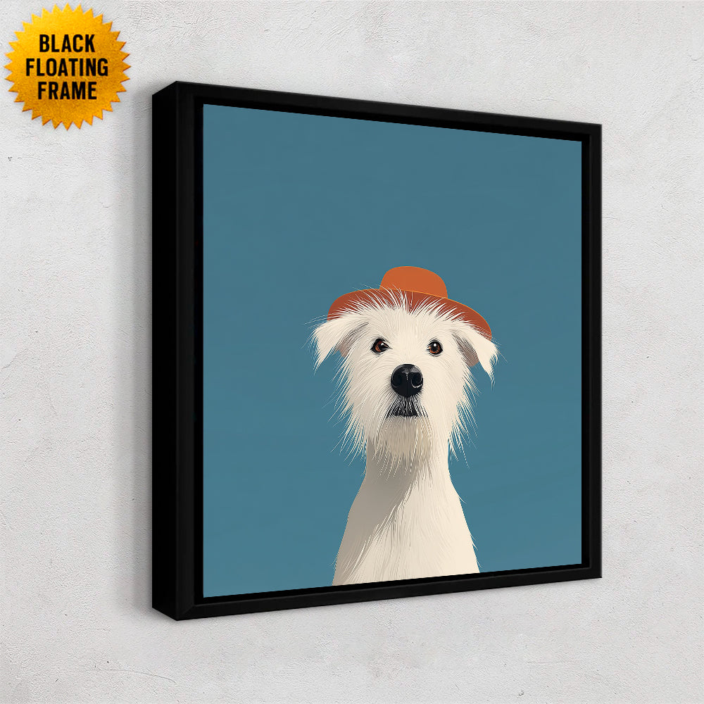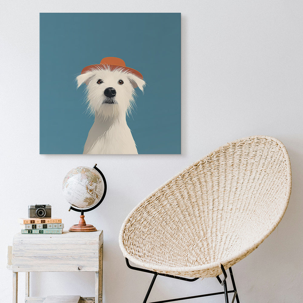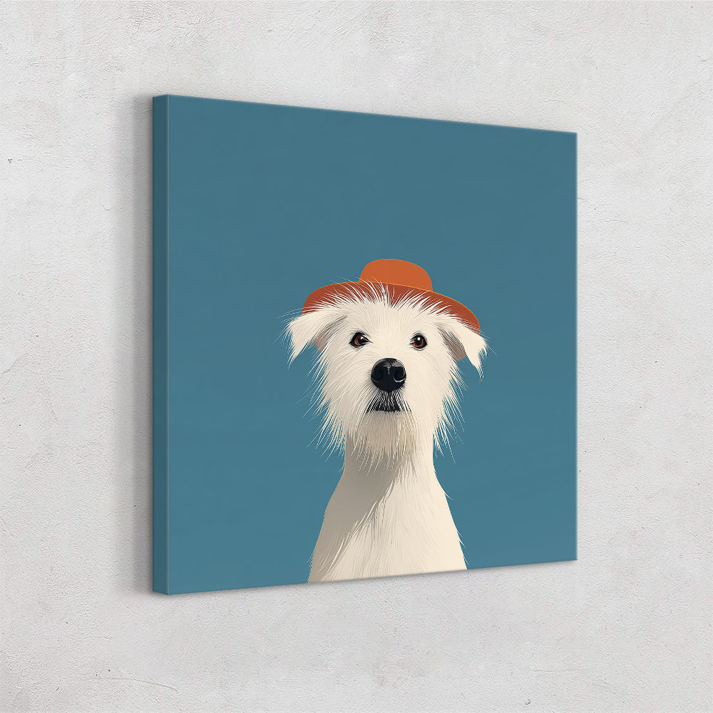 A minimalist portrait of a white terrier wearing a small brown hat against a muted blue background. The dog faces forward with an alert yet calm expression, its wiry fur softly textured and slightly tousled. The clean composition and playful styling give the image a modern, whimsical feel, celebrating personality and charm through simple, graphic design.