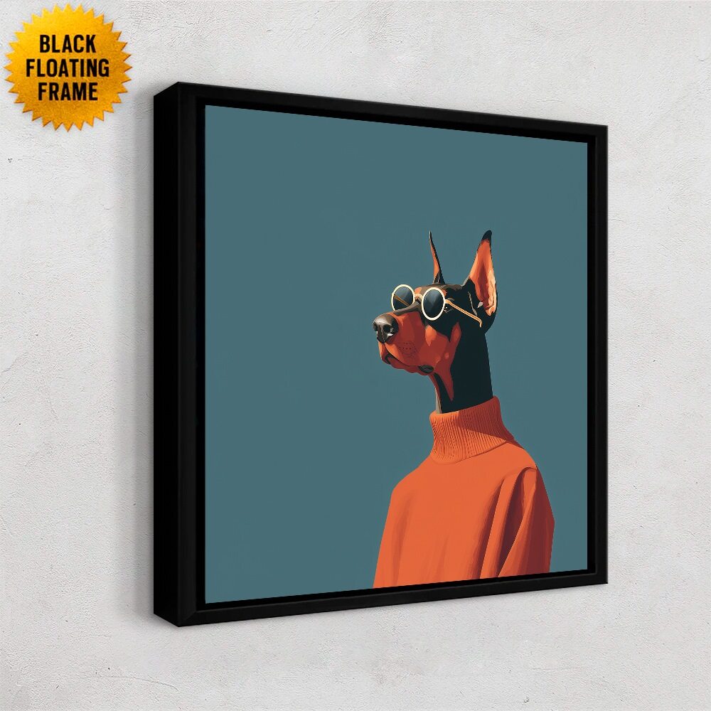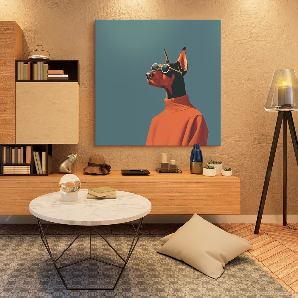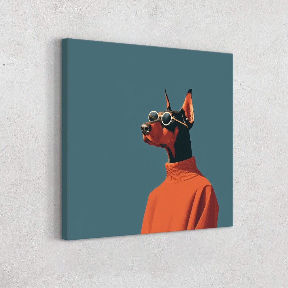 A stylized, minimalist portrait of a Doberman wearing round sunglasses and an orange turtleneck sweater against a muted teal background. The composition is clean and modern, blending fashion illustration with playful surrealism, giving the dog a calm, confident, almost human-like presence.
