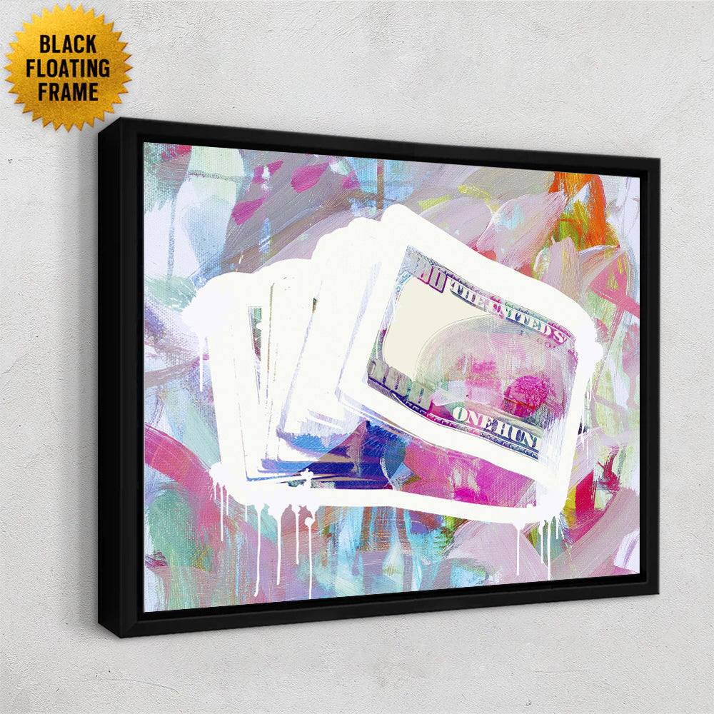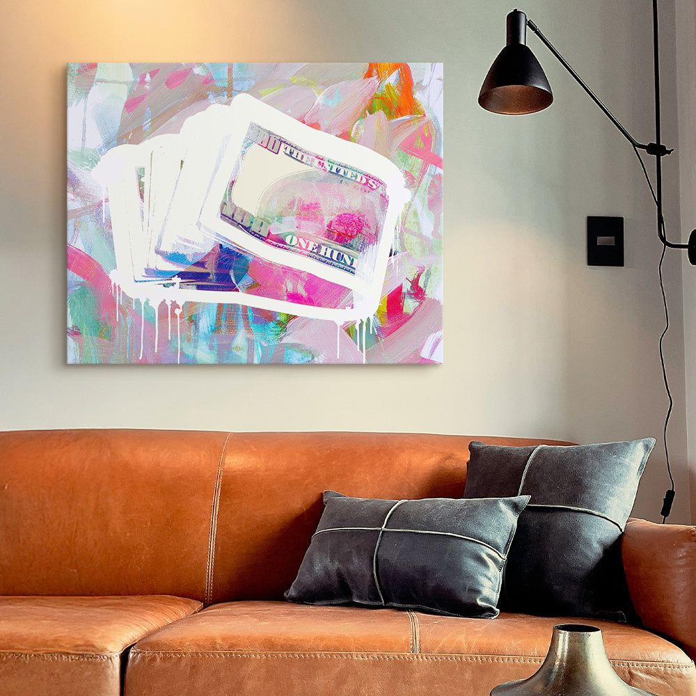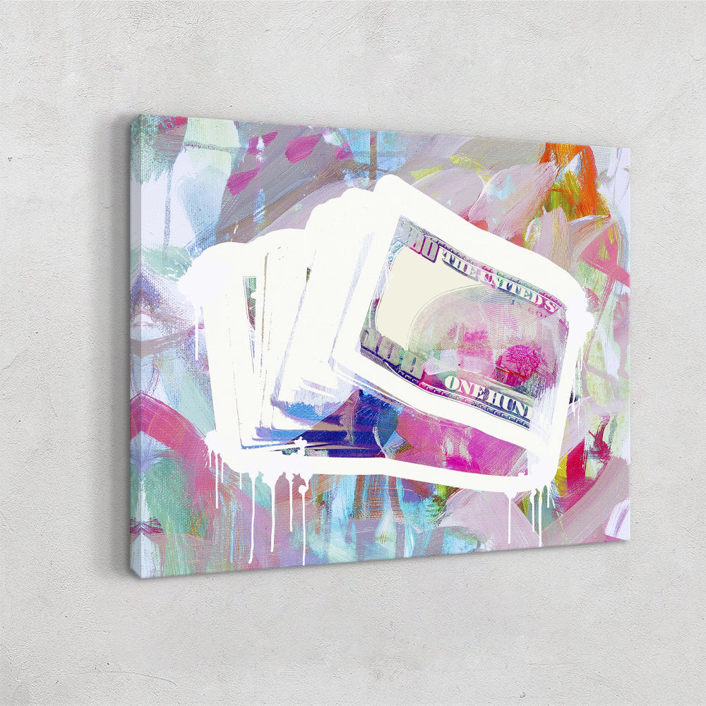 This artwork mixes modern pop-art energy with a splashy, abstract background for a bold, money-meets-art vibe. A stack of hundred-dollar bills sits at the center, outlined in bright white with paint drips that give it a raw, street-art feel. Behind it, loose swirls of pastel pinks, blues, and purples blend together in a soft, expressive painterly style. The contrast between the crisp currency imagery and the dreamy, chaotic backdrop makes the piece feel playful, edgy, and a little luxurious. It’s perfect for anyone who loves art that mixes creativity with a hint of hustle.