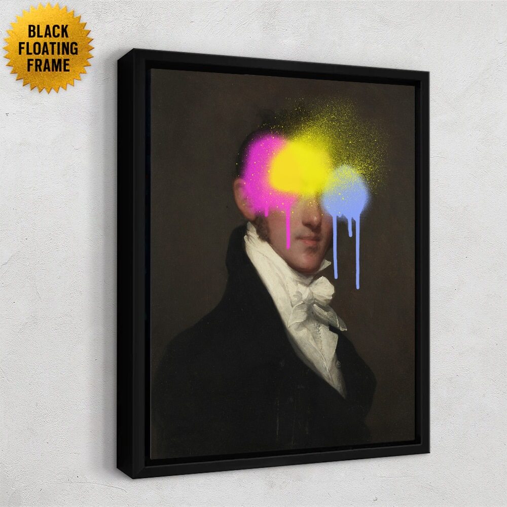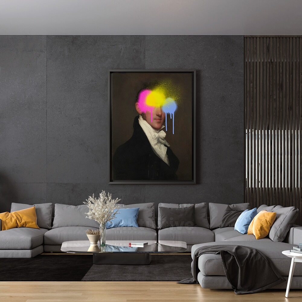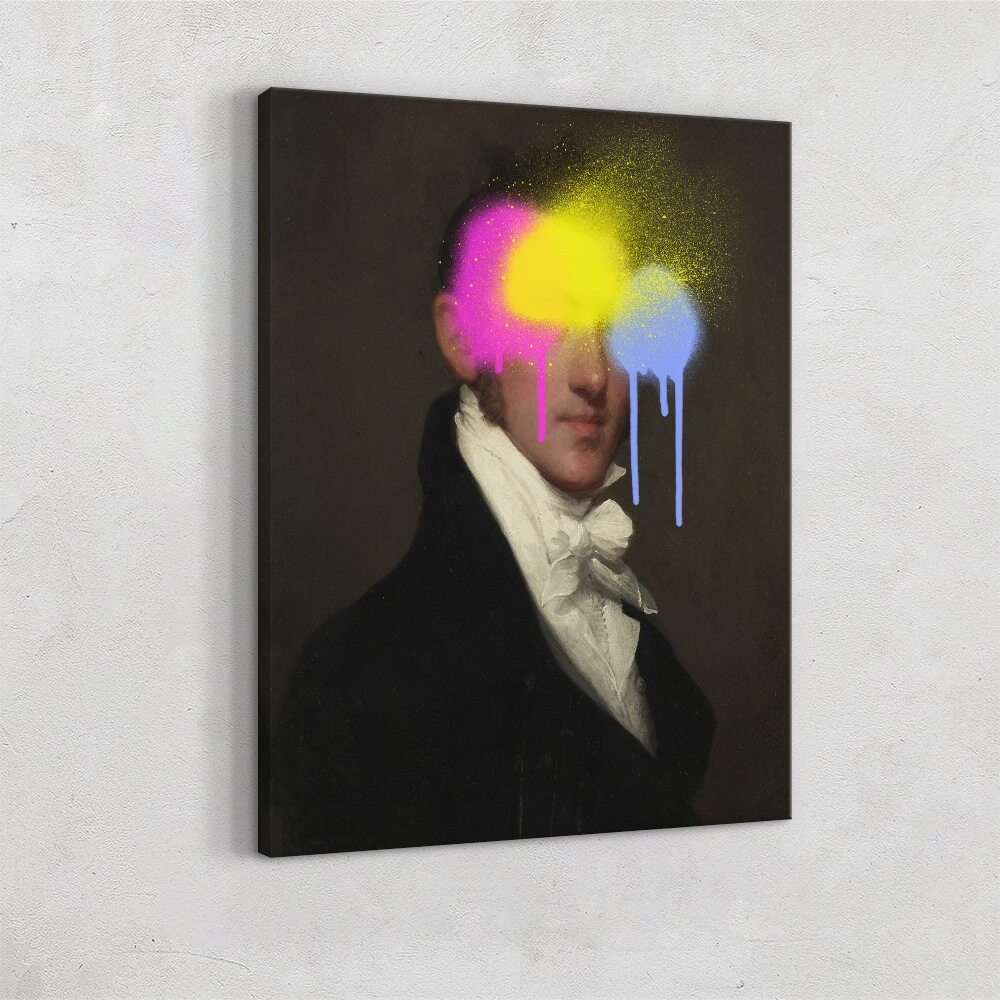 This artwork blends old-world portraiture with bold street-art energy. A classic, formal oil-style painting of a man in a dark coat and white cravat becomes instantly modern with neon spray-paint splashes across his eyes. Bright pink, yellow, and blue pigments drip dramatically down the canvas, giving the piece a rebellious, surreal vibe. It’s a striking mix of refinement and urban expression, perfect for anyone who loves edgy, contemporary twists on traditional art.