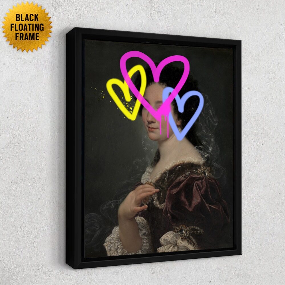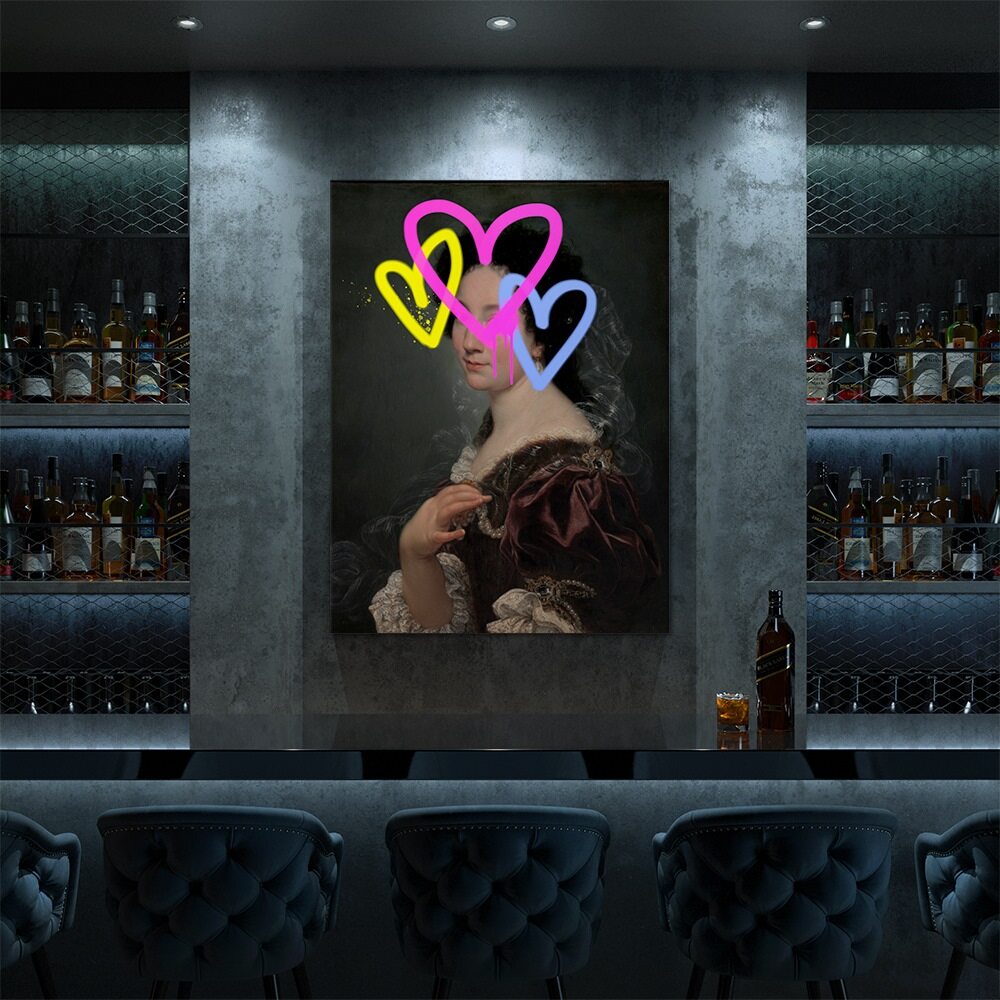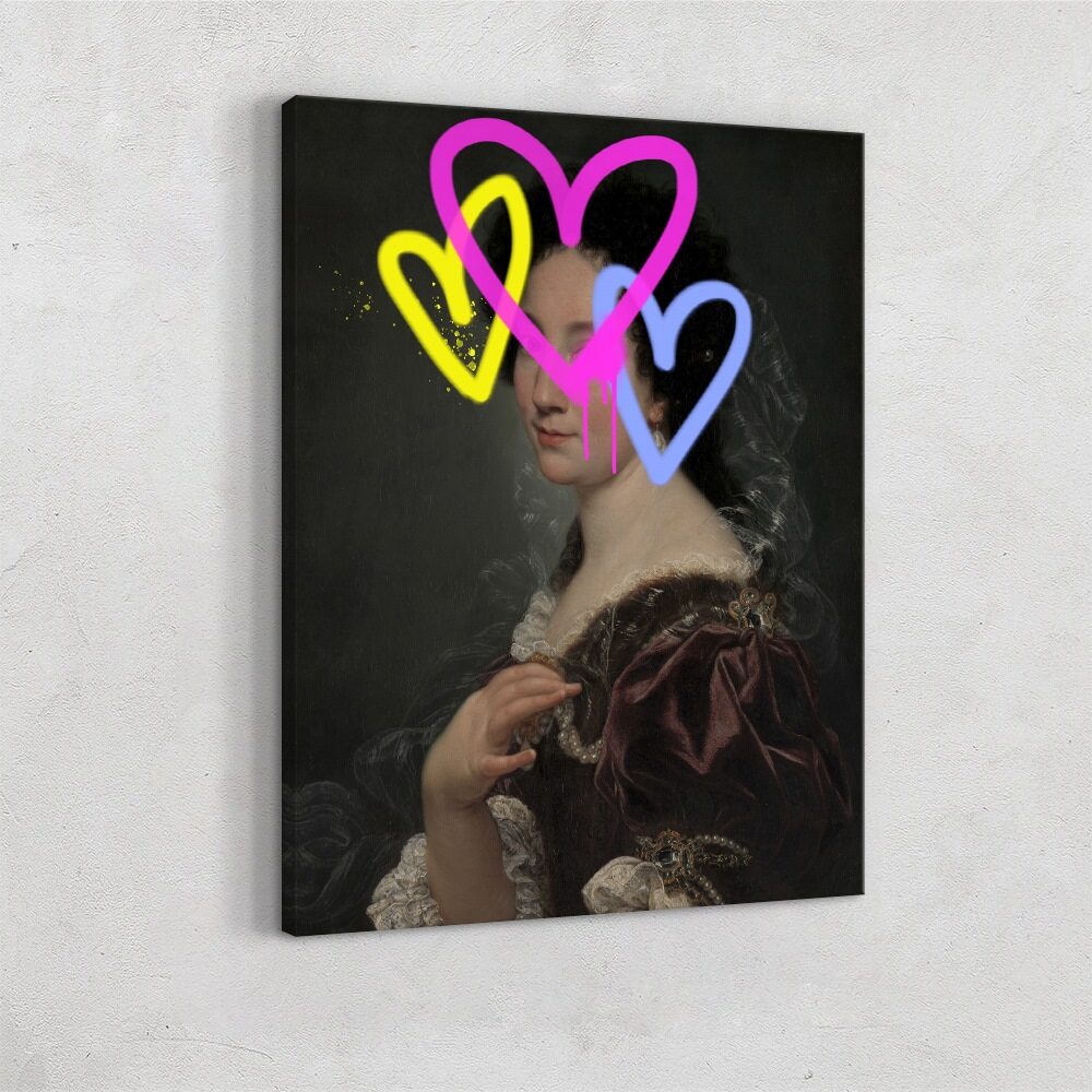This piece fuses classical portraiture with vibrant street-art flair. A traditional painting of a woman in an ornate, historic gown becomes electrified by bold neon graffiti layered across her face. Three hand-drawn hearts—pink, yellow, and blue—overlap and drip like fresh spray paint, creating a playful yet rebellious contrast against the refined brushwork beneath. The result is a striking collision of elegance and modern pop-art energy, perfect for contemporary spaces that celebrate contrast and creativity.