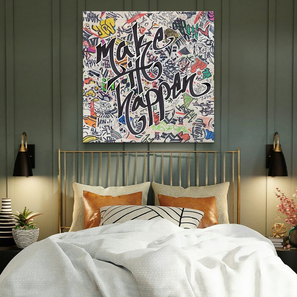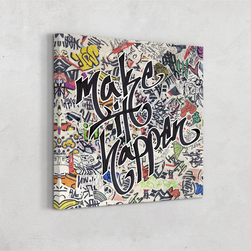 This “make it happen” artwork brings loud, expressive street-art energy to the forefront. The background is stacked with layers of tags, doodles, characters, and marker scribbles, creating that chaotic, creative wall-of-graffiti vibe. Front and center, the phrase make it happen is written in bold, flowing script that cuts cleanly through the noise. The contrast between the messy collage and the confident lettering gives the whole piece a motivating, go-for-it feel. Perfect for anyone who loves art that’s vibrant, urban, and full of attitude.