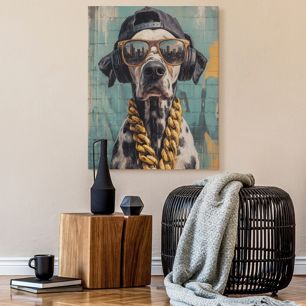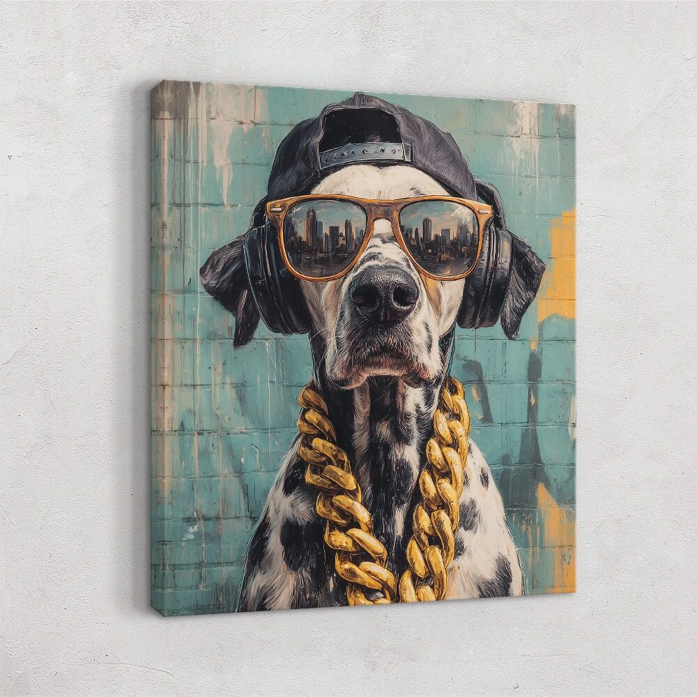 A stylized portrait of a dalmatian posed against a weathered teal wall, dressed in urban streetwear. The dog wears oversized sunglasses reflecting a city skyline, large headphones, a backward baseball cap, and a thick gold chain, blending playful humor with modern pop-art flair. The piece captures a confident, street-smart attitude while anthropomorphizing the dog in a bold, contemporary setting.