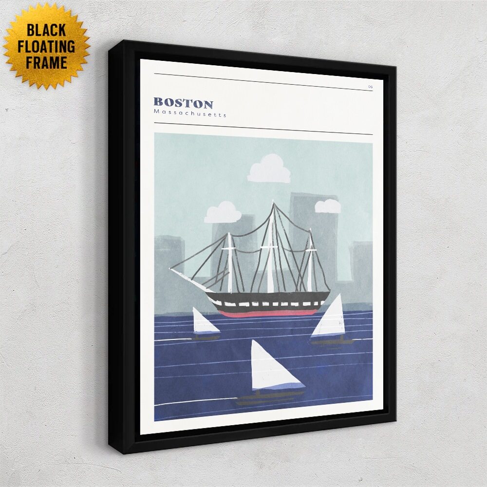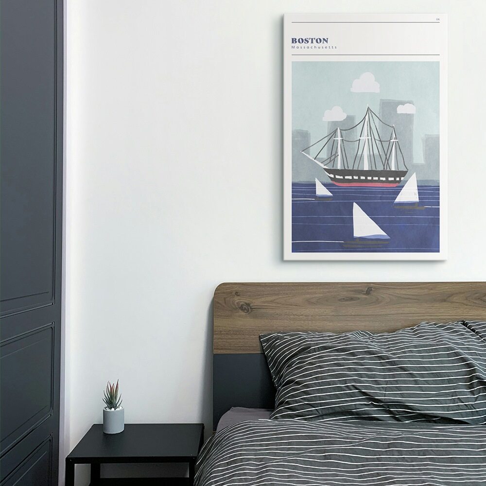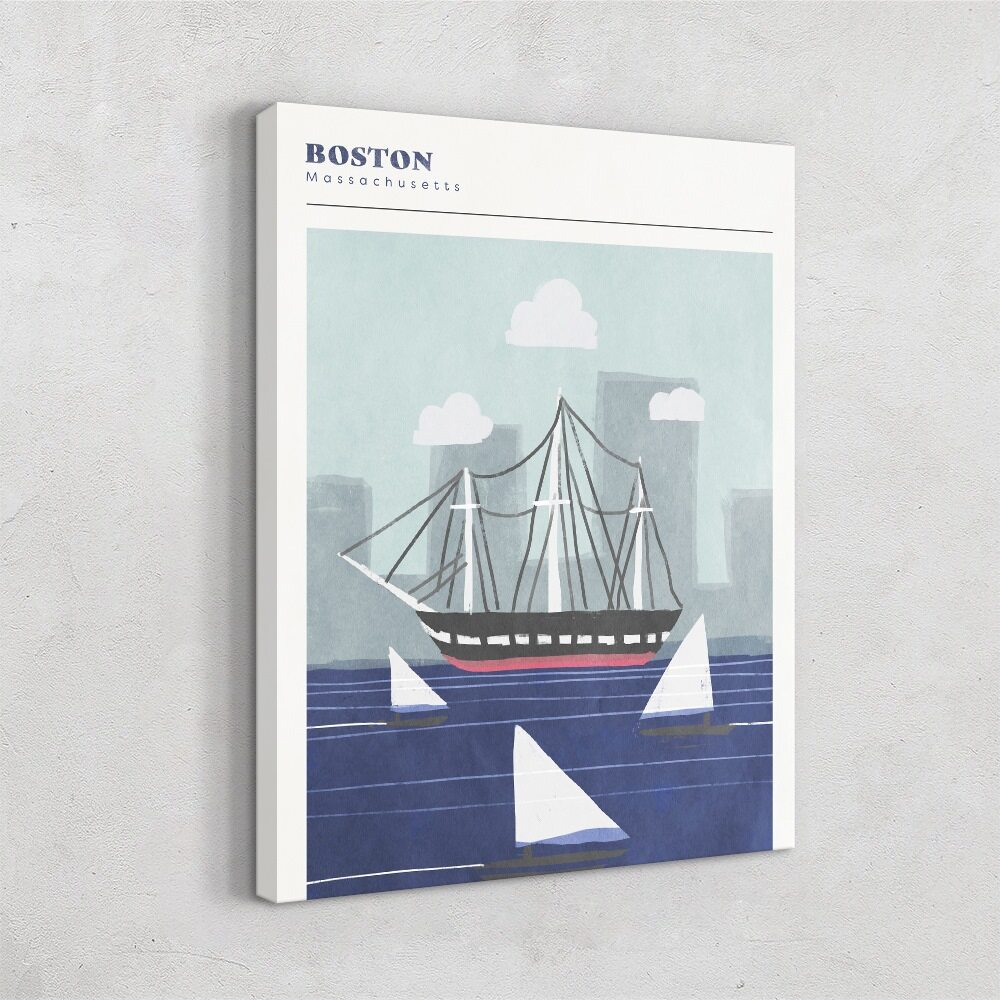 This Boston artwork has a clean, nautical vibe that mixes classic charm with a modern, minimal style. A historic ship sails across deep blue water, surrounded by simple white sailboats, while soft gray skyscrapers fade into the background. The light clouds and hand-painted textures keep the scene breezy and calm, giving it that signature Boston harbor feel without overwhelming detail. It’s a fresh, laid-back tribute to the city’s coastal character.
