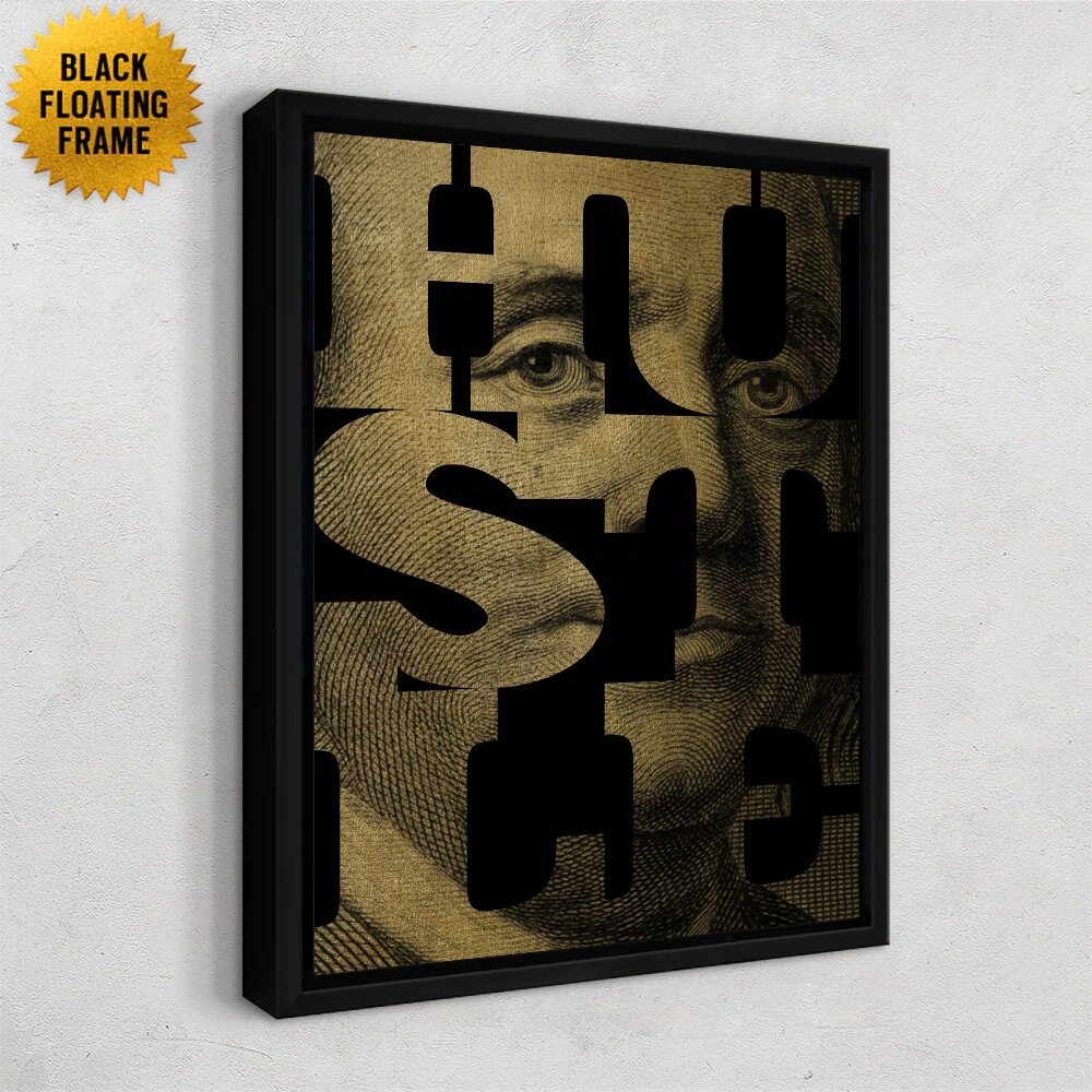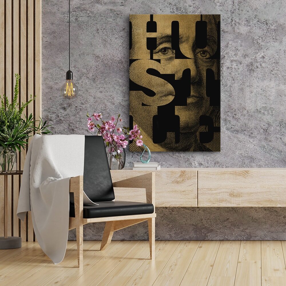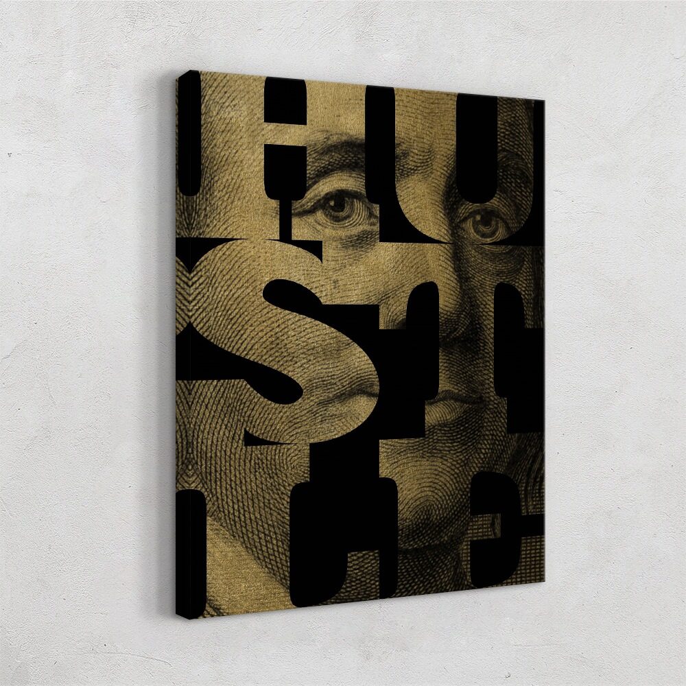 This artwork blends classic currency imagery with bold modern design, using Benjamin Franklin’s portrait from the hundred-dollar bill as the backdrop. Thick lettering spelling Hustle cuts across the piece, revealing portions of his face through clean geometric shapes. The contrast between the vintage texture of the bill and the sharp, contemporary typography gives it a smart, stylish edge. It feels motivational without being loud, making it perfect for anyone who appreciates art with a clever mix of history, ambition, and modern attitude.