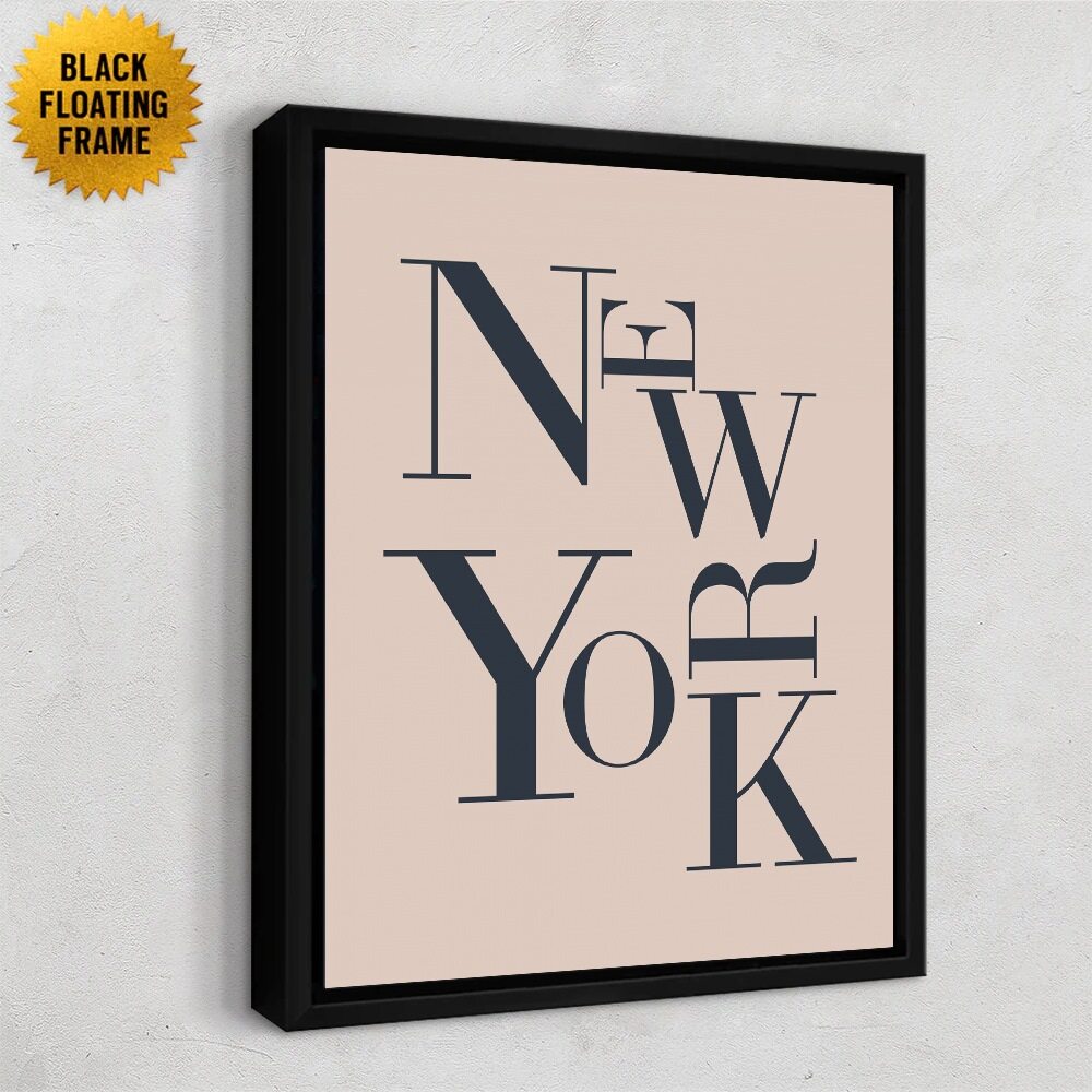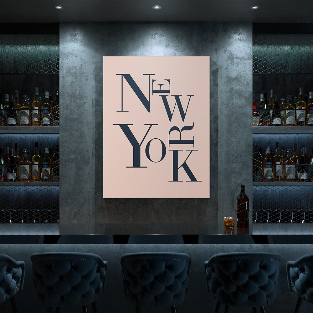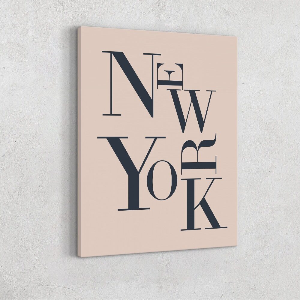 This typographic New York print plays with scale, spacing, and elegant serif lettering to create a stylish, modern composition. The letters stack and overlap in an artful layout that feels both bold and refined, making it a great statement piece for lovers of clean design or city-inspired decor. The soft blush background contrasts nicely with the deep navy text for a sophisticated, minimalist look.