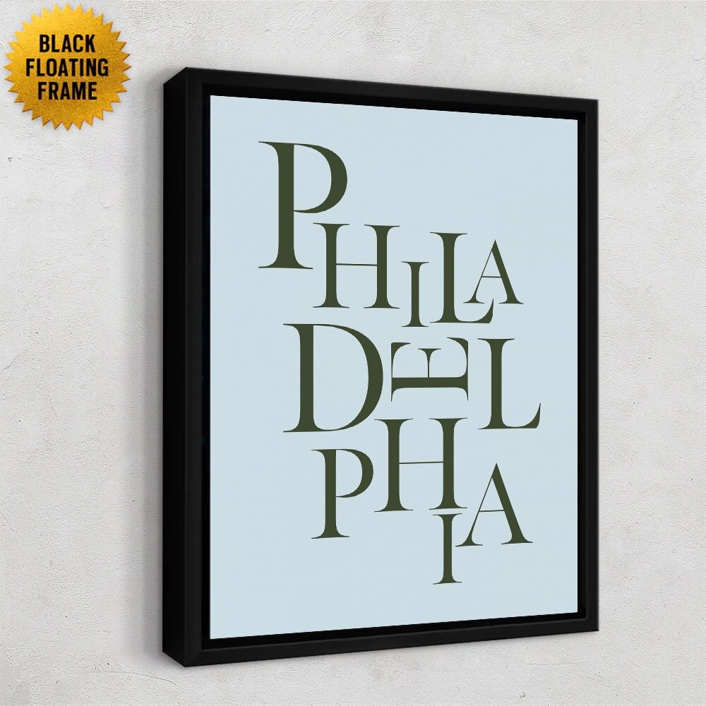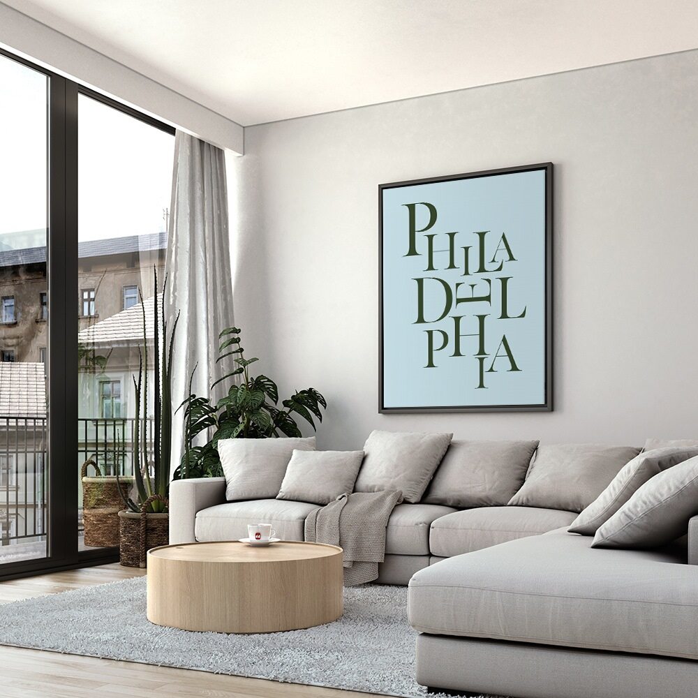 This Philadelphia typographic print features the city’s name arranged in a bold, architectural layout that feels refined and contemporary. Deep forest-green serif letters stack and interlock against a soft powder-blue background, giving the composition a clean, modern elegance. Perfect for gallery walls, home offices, or anyone who wants a stylish tribute to the City of Brotherly Love.