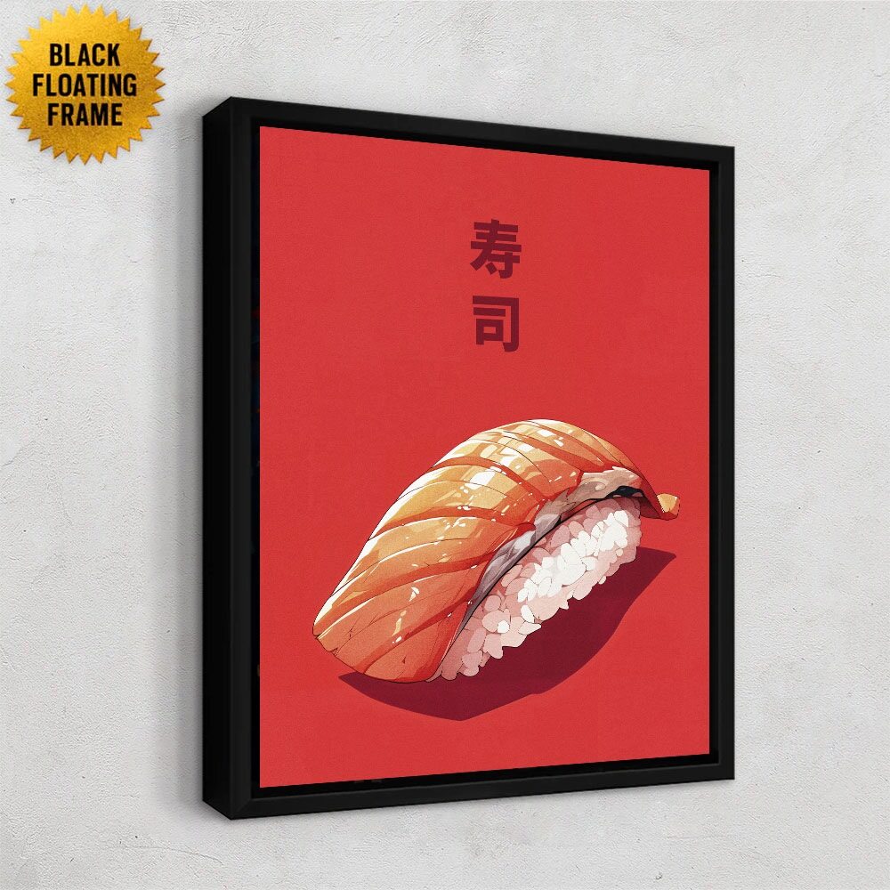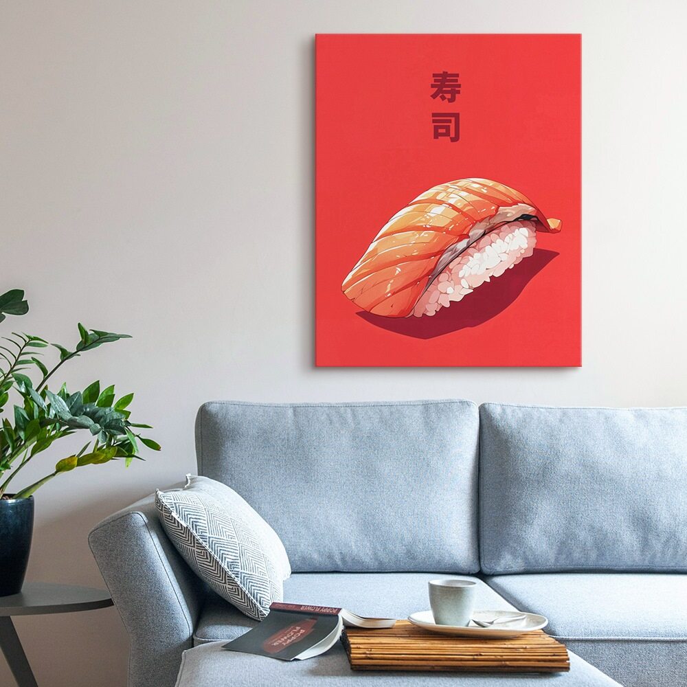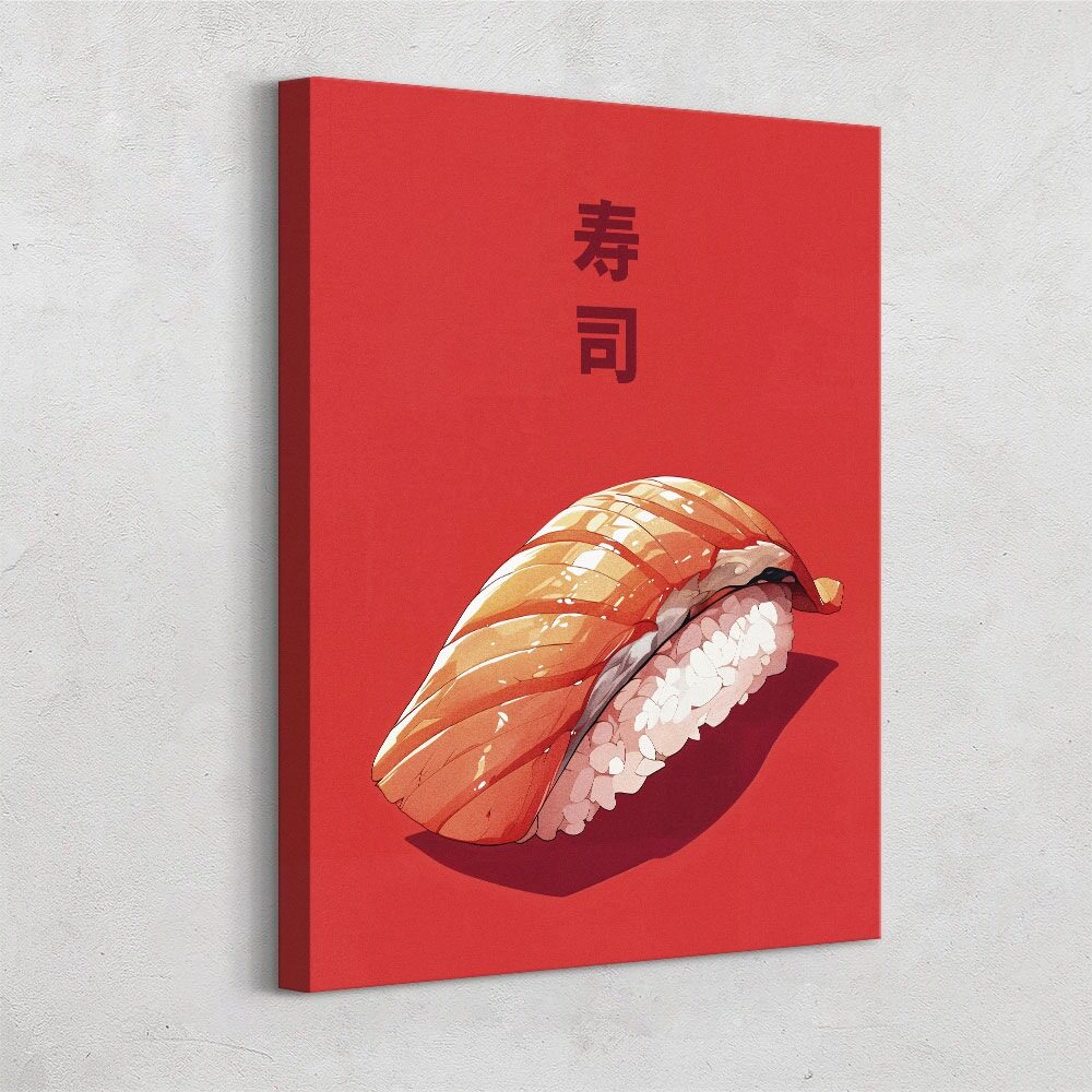 A stylized illustration of a single piece of salmon nigiri sushi is centered against a bold red background. The fish has glossy, reflective highlights that give it a fresh, appetizing appearance, while the rice beneath is softly textured with visible grains. Above the sushi, two large Japanese kanji characters appear in a darker red, adding a minimal yet striking graphic element. The overall style is clean, modern, and slightly painterly, emphasizing simplicity and visual impact.