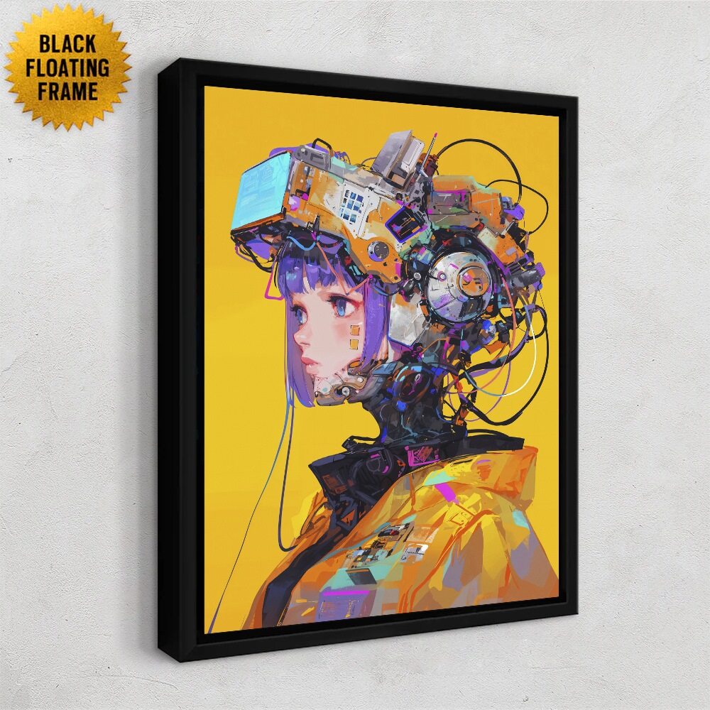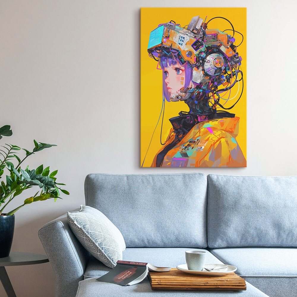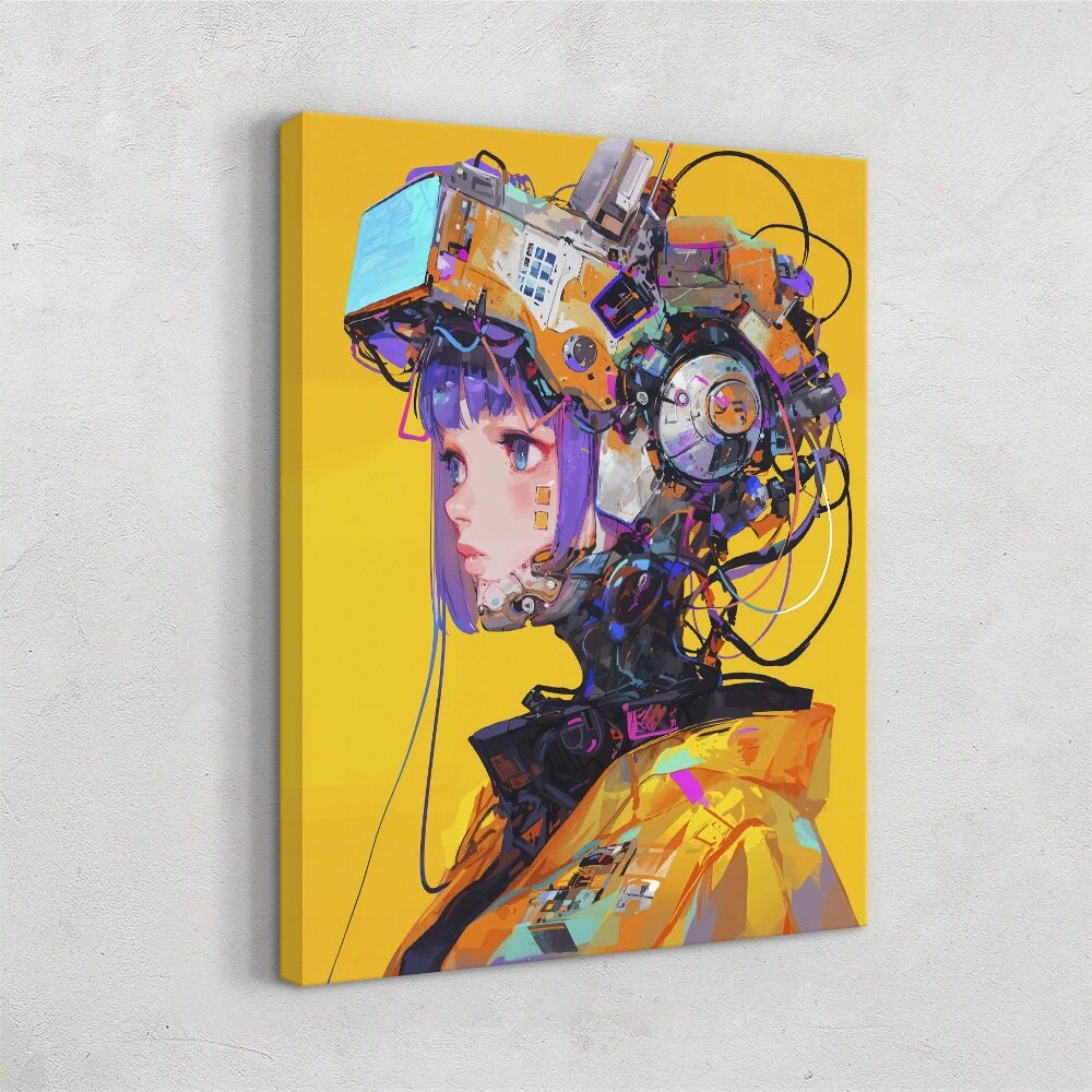 A vibrant cyberpunk-style illustration of a young woman in profile against a bright yellow background. She has short purple hair and wears an intricate, futuristic helmet composed of wires, screens, gears, and mechanical components. Her expression is calm and focused, and she wears a yellow, reflective jacket that complements the bold color palette. The artwork blends anime-inspired character design with detailed sci-fi machinery, giving it a high-tech, imaginative feel.