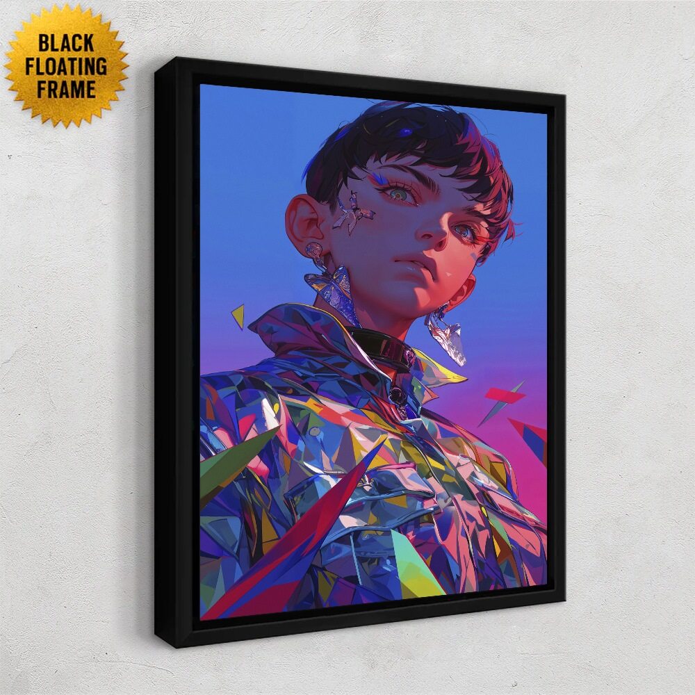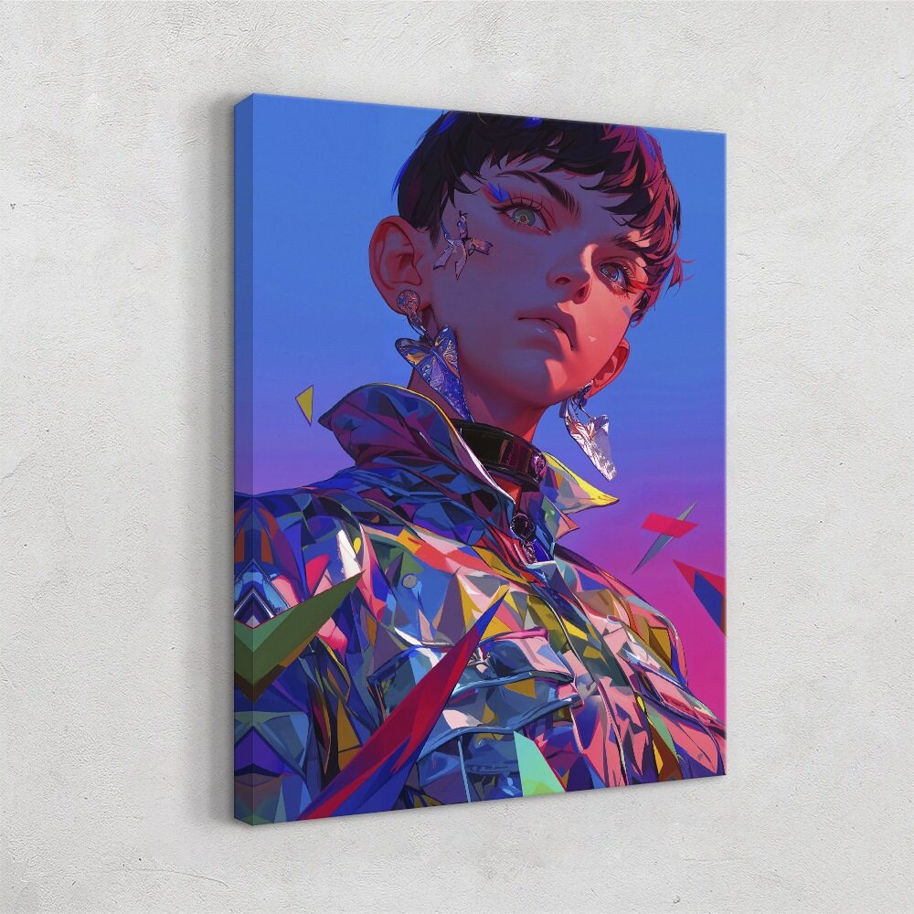 A digital portrait of a young person with short dark hair, standing confidently against a gradient sky that shifts from deep blue to magenta. Their expression is calm yet intense, with golden, reflective eyes that catch the light. They wear a futuristic, iridescent jacket made of sharp, prism-like facets that scatter colorful shards of light in every direction. Floating geometric fragments—like pieces of broken glass or crystal—surround them, reinforcing the theme of “fracture.” The lighting is dramatic, casting cool blues and warm pinks across the figure, creating a striking, surreal, and emotionally charged atmosphere.