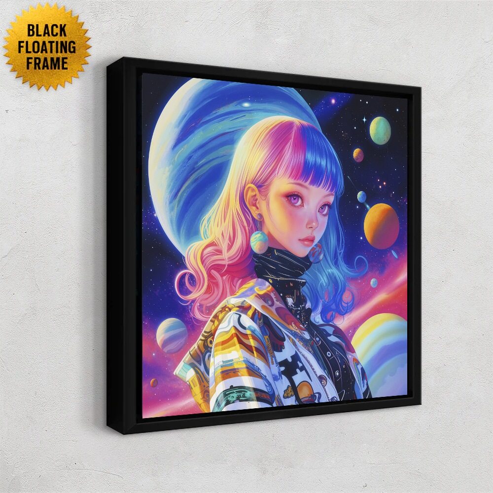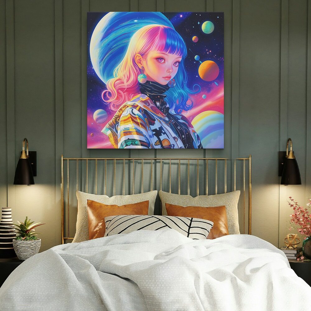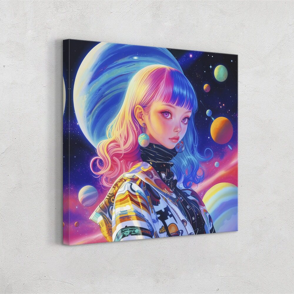 A vibrant, futuristic portrait of a young woman set against a cosmic backdrop filled with glowing planets and swirling nebulae. Her hair is split-dyed in pastel pink and blue, mirroring the colorful galaxies behind her. She wears a high-collared, patterned jacket with a sci-fi aesthetic, and her spherical earrings resemble miniature planets. The lighting is ethereal, blending neon hues of purple, turquoise, and gold to create a dreamy, otherworldly effect.