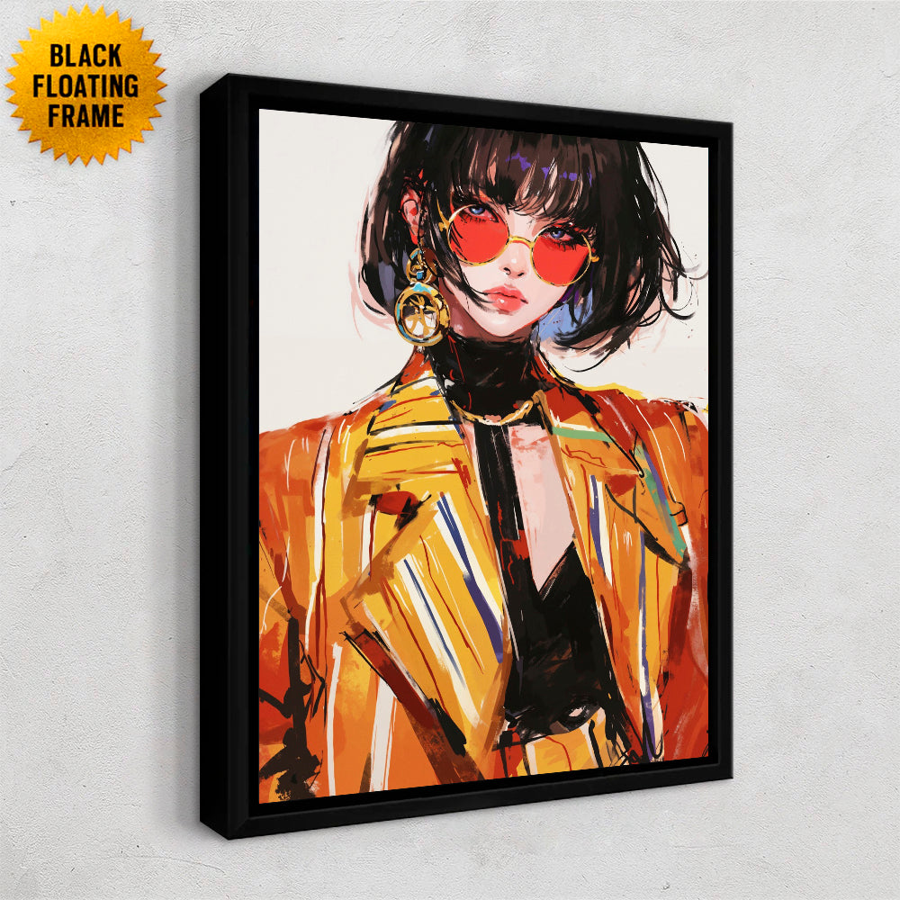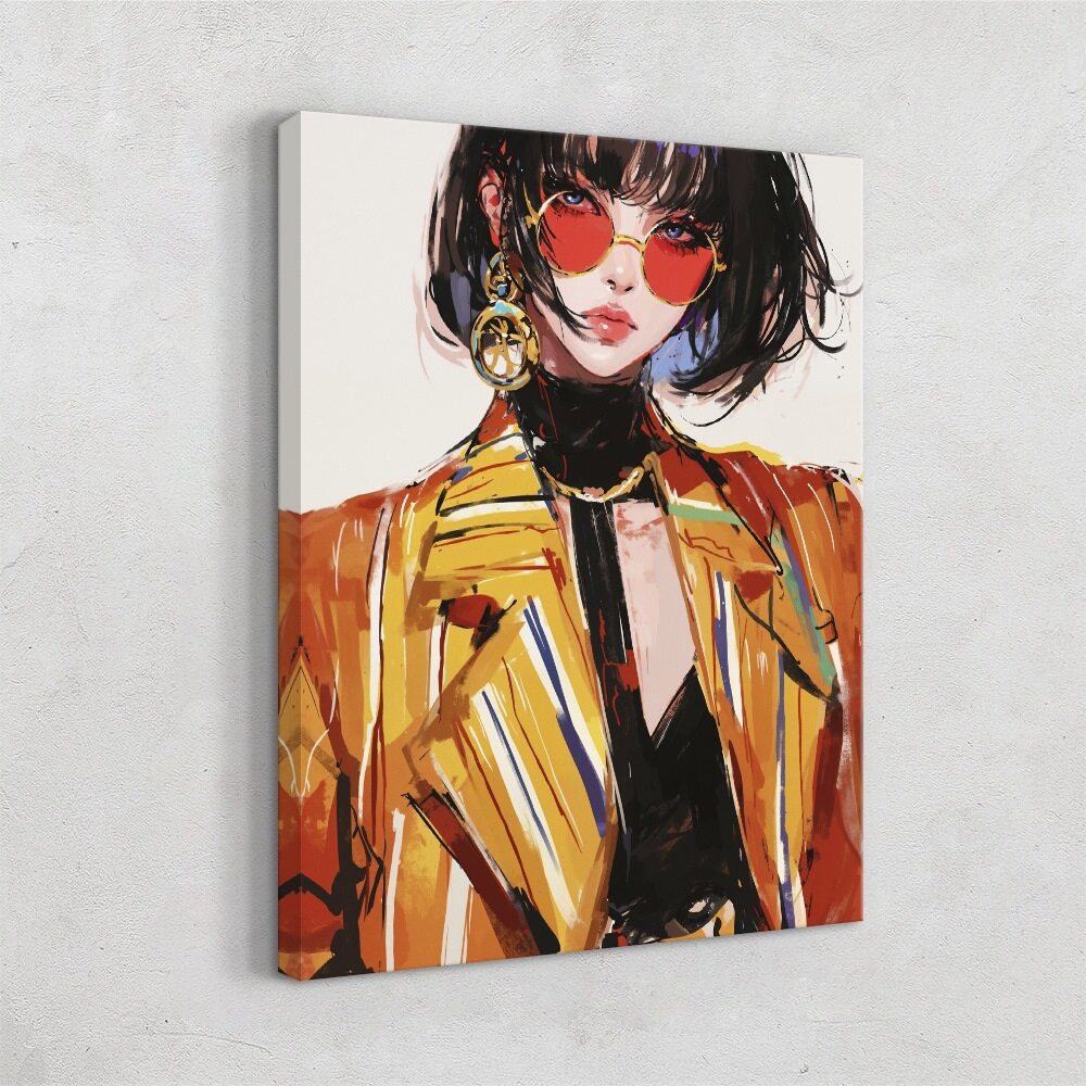 “Gingko Perception” blends high-fashion attitude with bold, expressive brushwork to create a portrait that feels both modern and mythic. The subject—poised and sharp-eyed behind vivid red sunglasses—radiates self-assurance and artistic edge. Their tousled dark hair frames a face marked by cool defiance, while oversized gold earrings and a statement chain elevate the look to editorial chic. The jacket, alive with mustard-gold strokes and abstract color fields, produces a sense of movement like wind through ginkgo leaves—suggesting shifting perspectives, awakening, and clarity. The artwork captures the sensation of perceiving the world through layers of color, emotion, and intuition.
