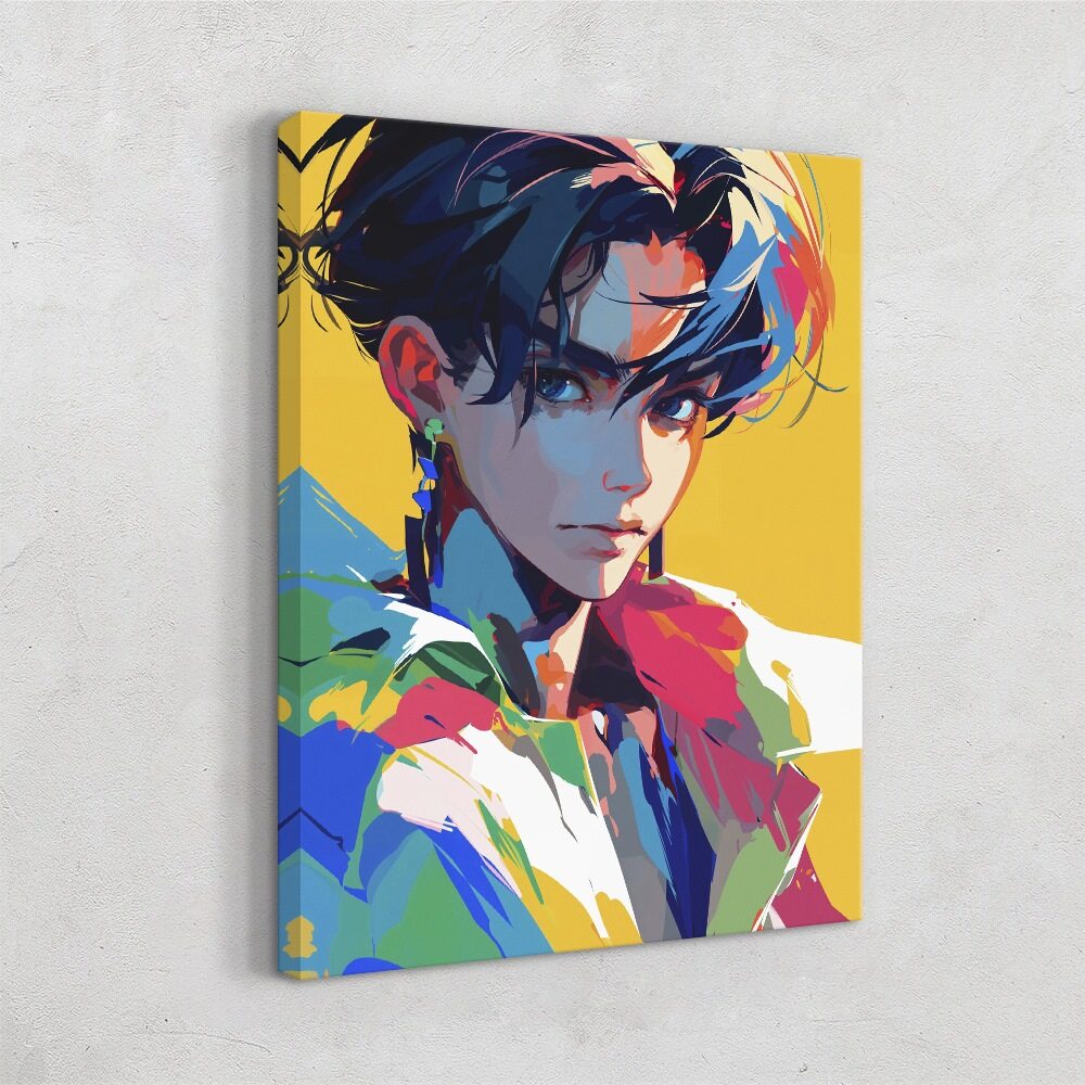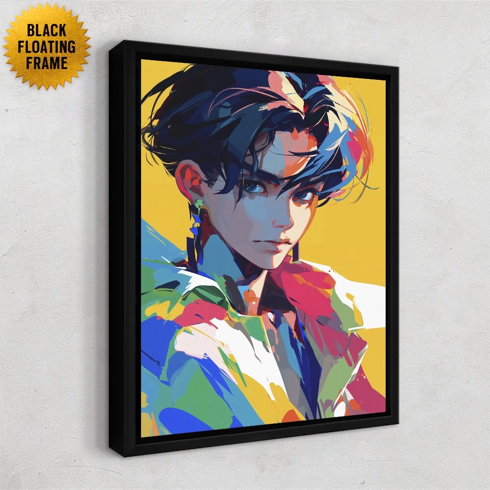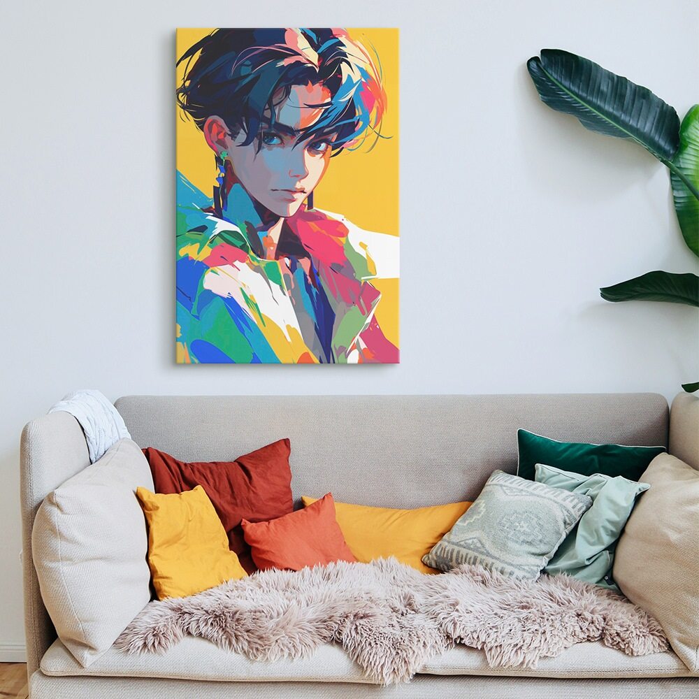Framed colorful artwork of a stylized character on a white wall.