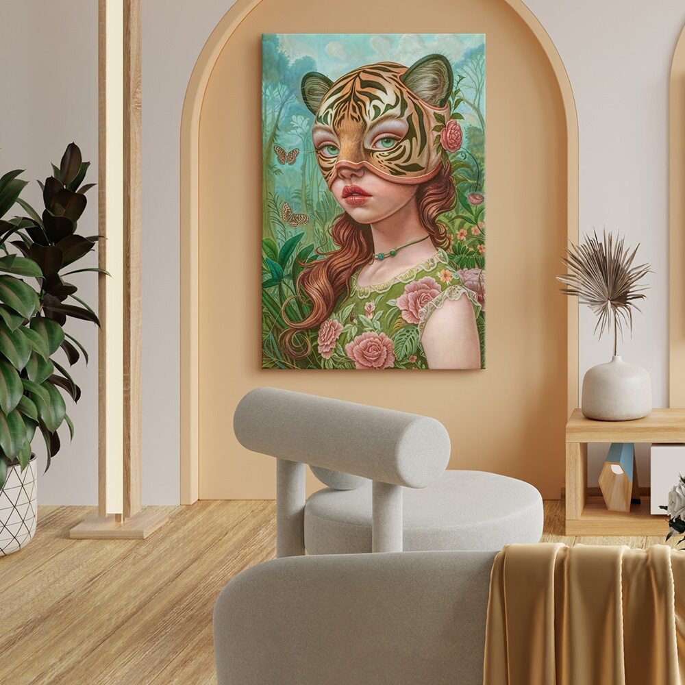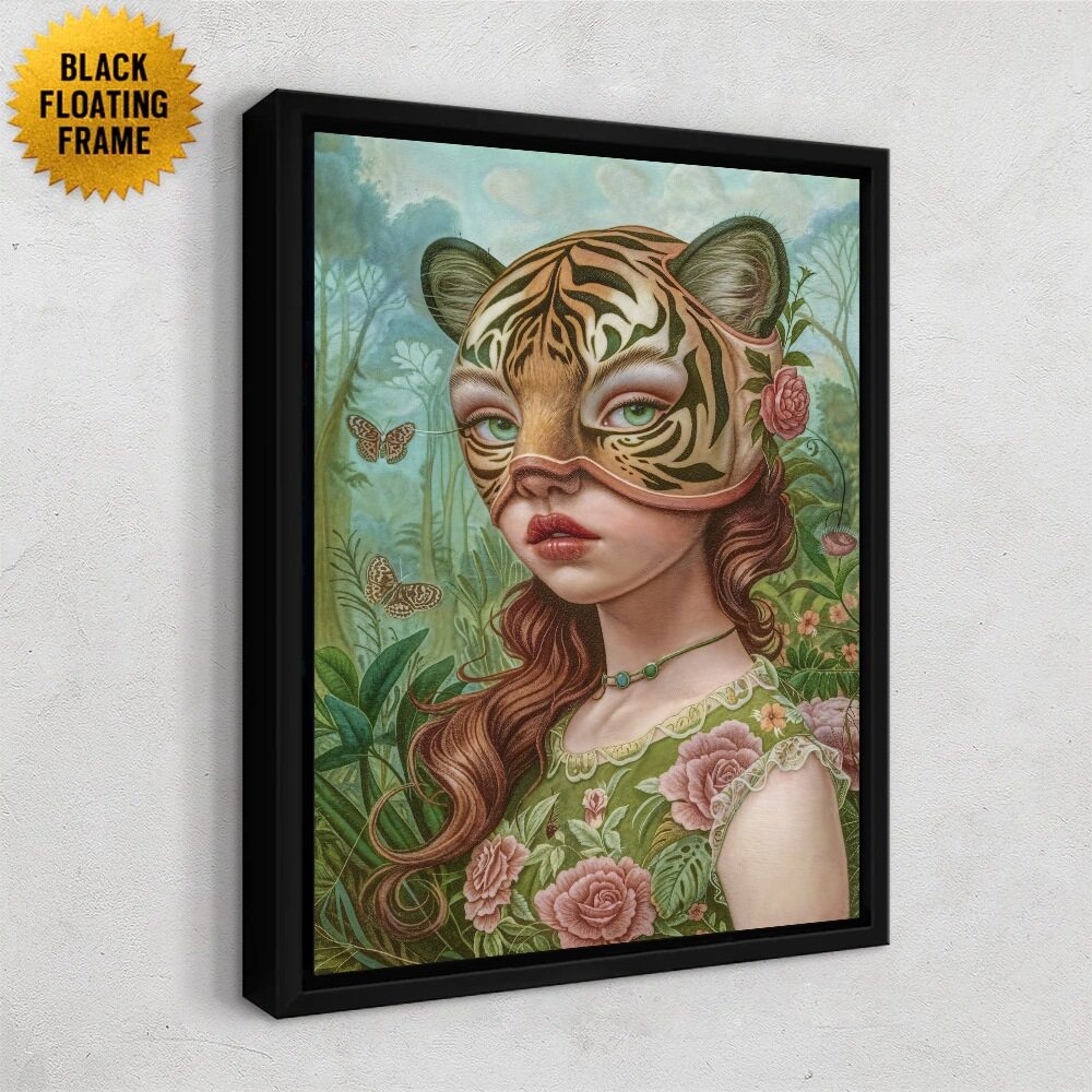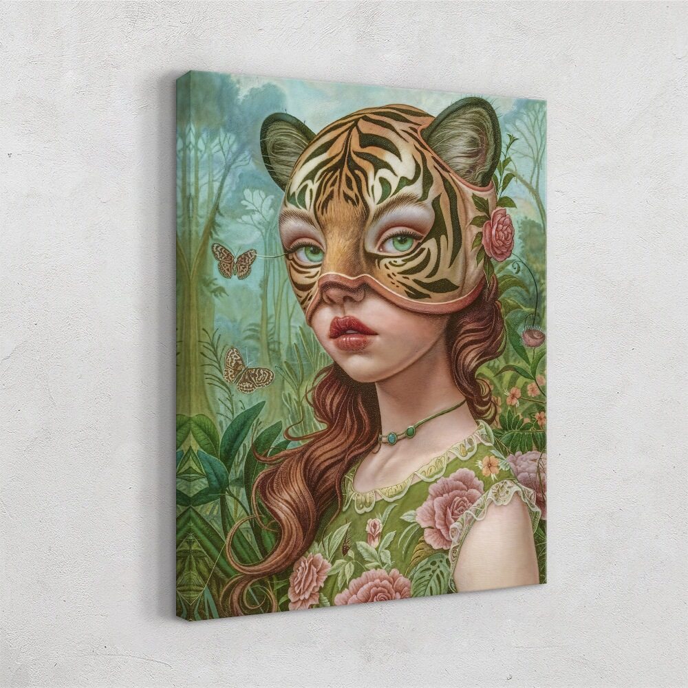 A surreal portrait of a young woman wearing an ornate tiger mask, blending fantasy and innocence. Her flowing auburn hair, floral dress, and delicate jewelry contrast with the wild, striking mask that partially obscures her expression. Surrounded by lush greenery and fluttering butterflies, she appears both hidden and revealed—an enigmatic figure caught between human vulnerability and animal strength. The muted, painterly tones lend the piece a dreamlike, fairytale quality.