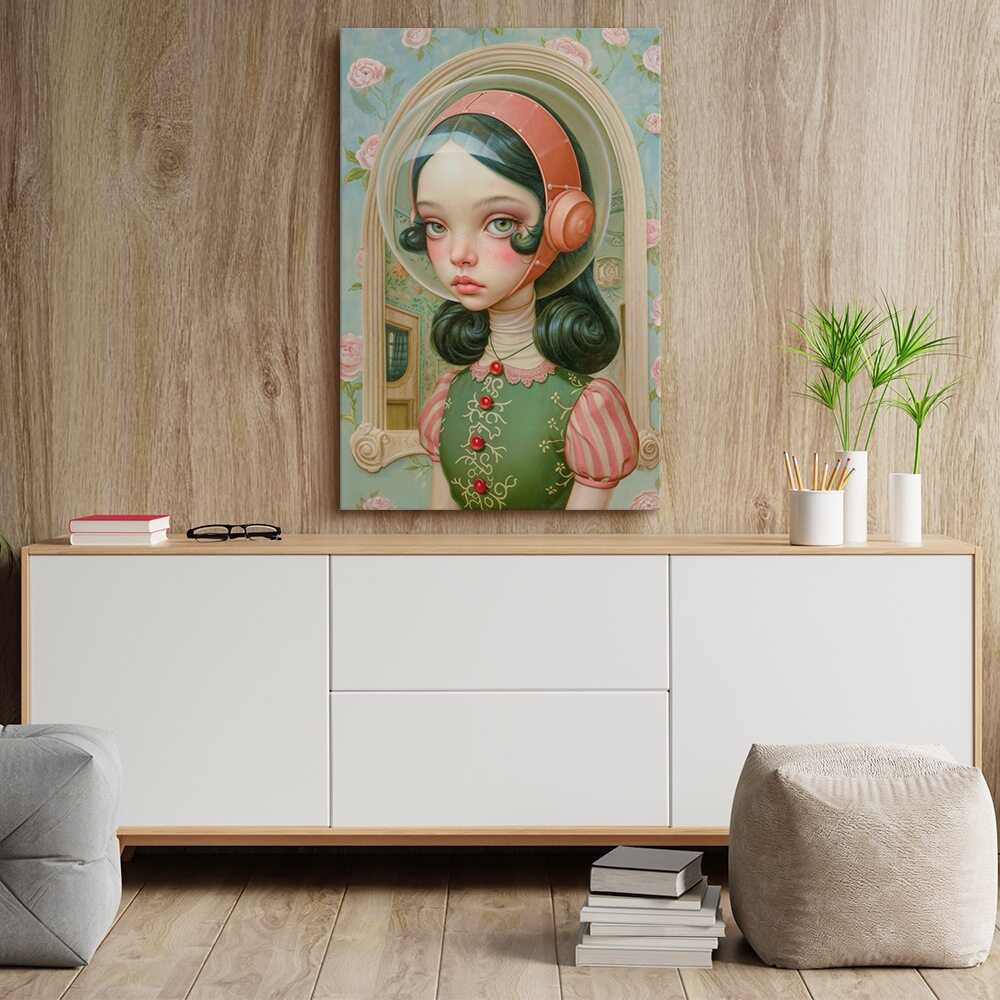 A surreal portrait of a young girl rendered in a soft, vintage storybook style. She wears a retro space-helmet–like dome over her head, giving the impression of emotional or physical separation from the world around her. Her wide, glossy eyes convey quiet longing, while her old-fashioned dress, decorated with floral patterns and delicate details, contrasts with the futuristic helmet. The background features pastel wallpaper and a window, creating an atmosphere that feels both nostalgic and otherworldly. The overall mood captures the essence of loneliness, introspection, and the fragile boundary between inner and outer worlds—fitting for the theme “Isolation.”