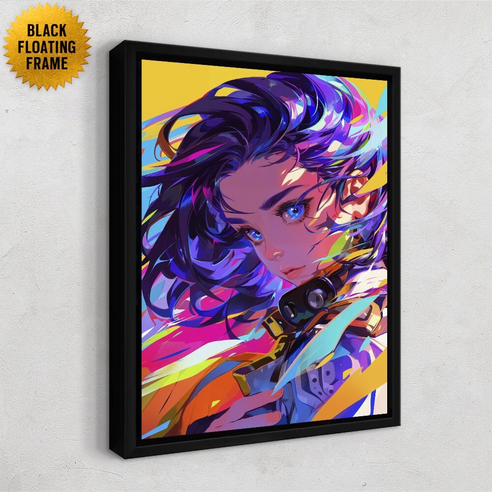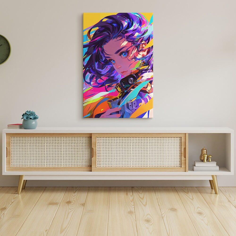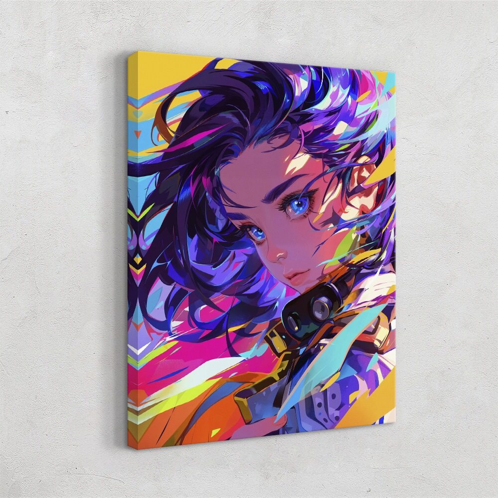 Colorful anime-style portrait of a person with bright blue eyes and flowing multicolored hair, surrounded by dynamic neon streaks, wearing a futuristic collar on a yellow background.