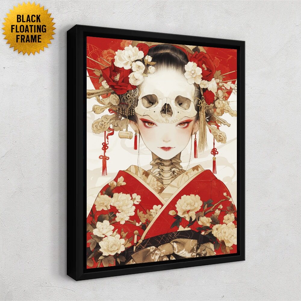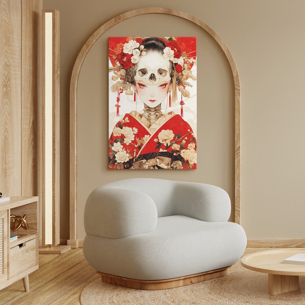 Stylized portrait of a woman in a red and gold floral kimono wearing a delicate skull mask, surrounded by flowers and ornate hair accessories, blending Japanese traditional elements with gothic fantasy.