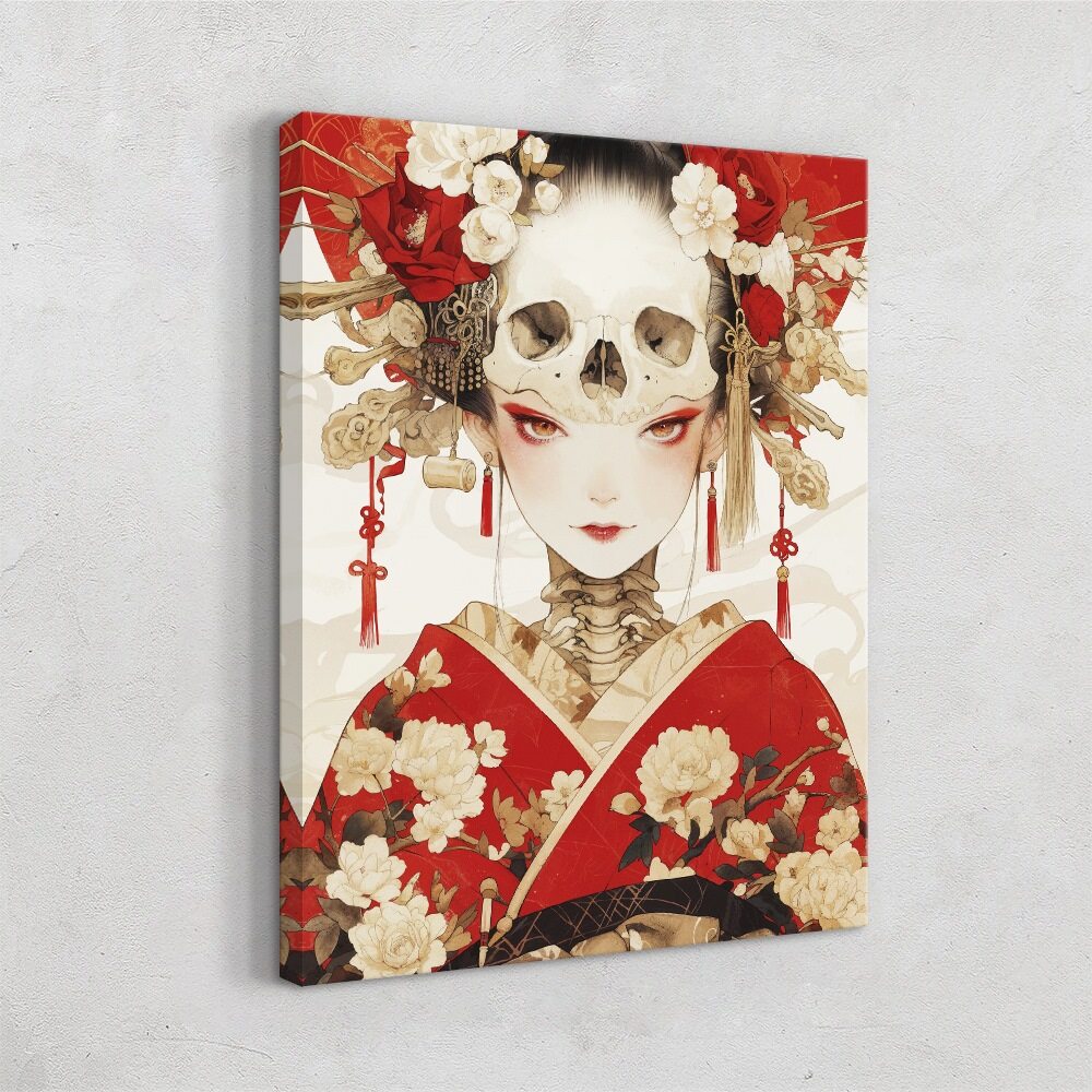 A hauntingly elegant portrait of a woman in ornate, ceremonial attire blending beauty, danger, and mysticism. She wears a lavish red and gold kimono adorned with intricate floral patterns, while her pale face is partially obscured by a delicate skull mask that evokes the image of death personified. Her expression is calm yet piercing, enhanced by dramatic red eye makeup and symmetrical accessories that drape gracefully around her. White flowers woven into her hair contrast with the deep reds surrounding her, symbolizing both innocence and mortality. The artwork combines traditional Japanese aesthetics with gothic fantasy, creating a powerful depiction of “Lady Death” as both ethereal and commanding.
