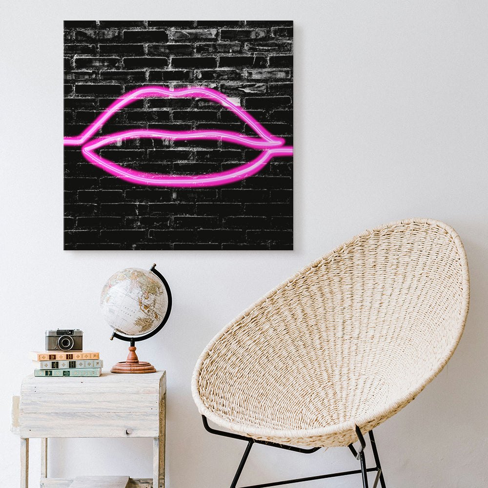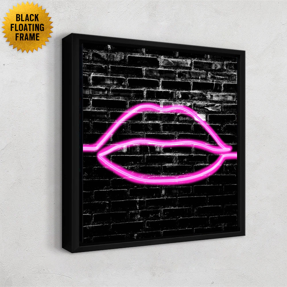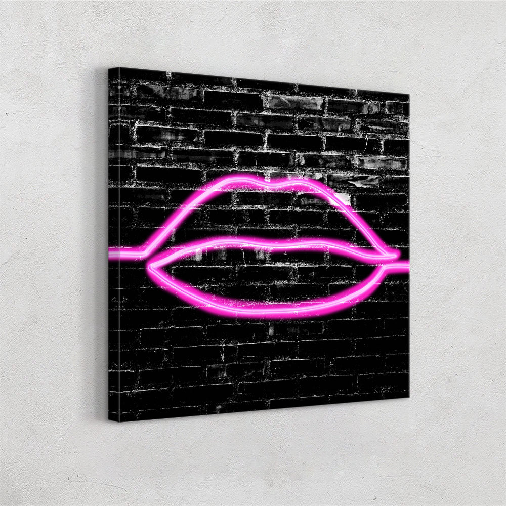 This modern neon-style artwork features a striking pair of lips outlined in vivid pink light against a dark brick wall. The minimal line design gives the piece a clean, edgy look while the glowing effect adds a bold pop of color and attitude. Perfect for adding a touch of nightlife energy to bedrooms, lounges, studios, or any contemporary space that embraces urban style and playful edge.