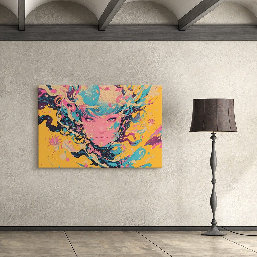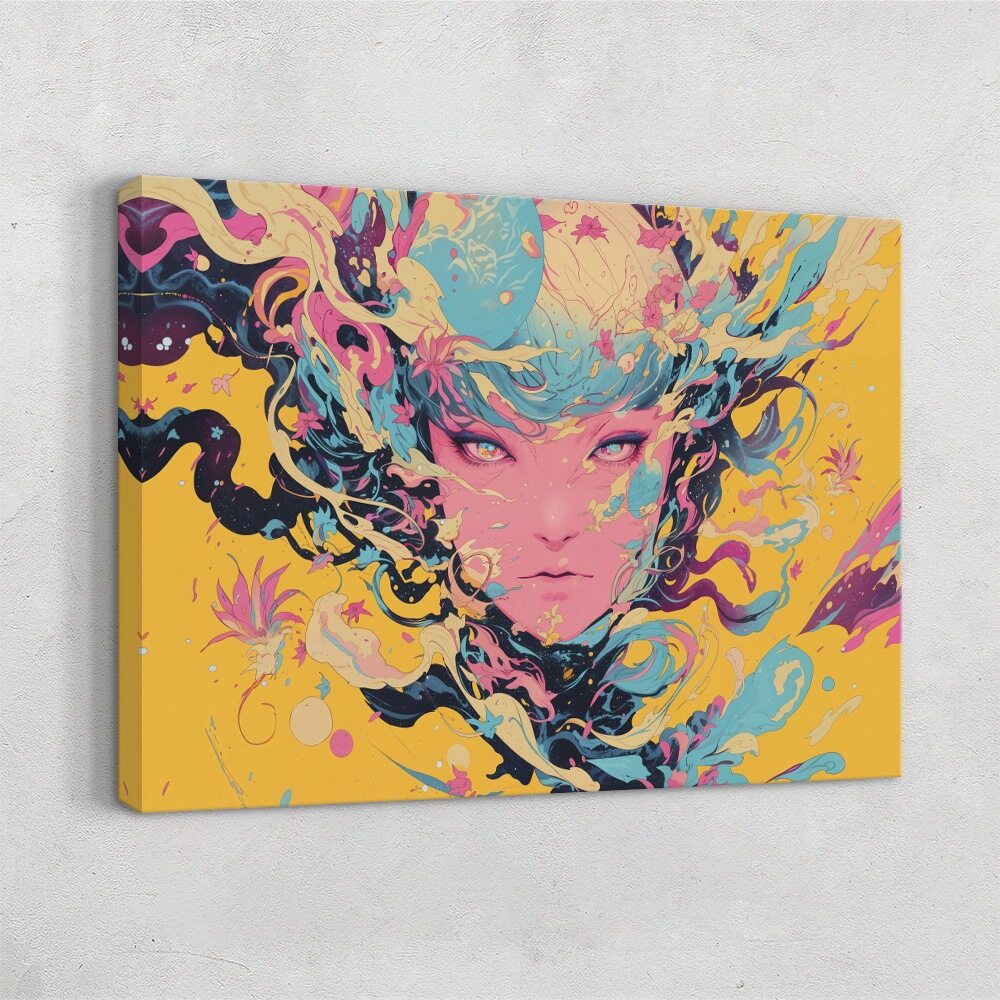 Vibrant surreal portrait of a woman’s face surrounded by swirling abstract shapes and colorful flowing patterns on a yellow background, symbolizing creative manifestation.