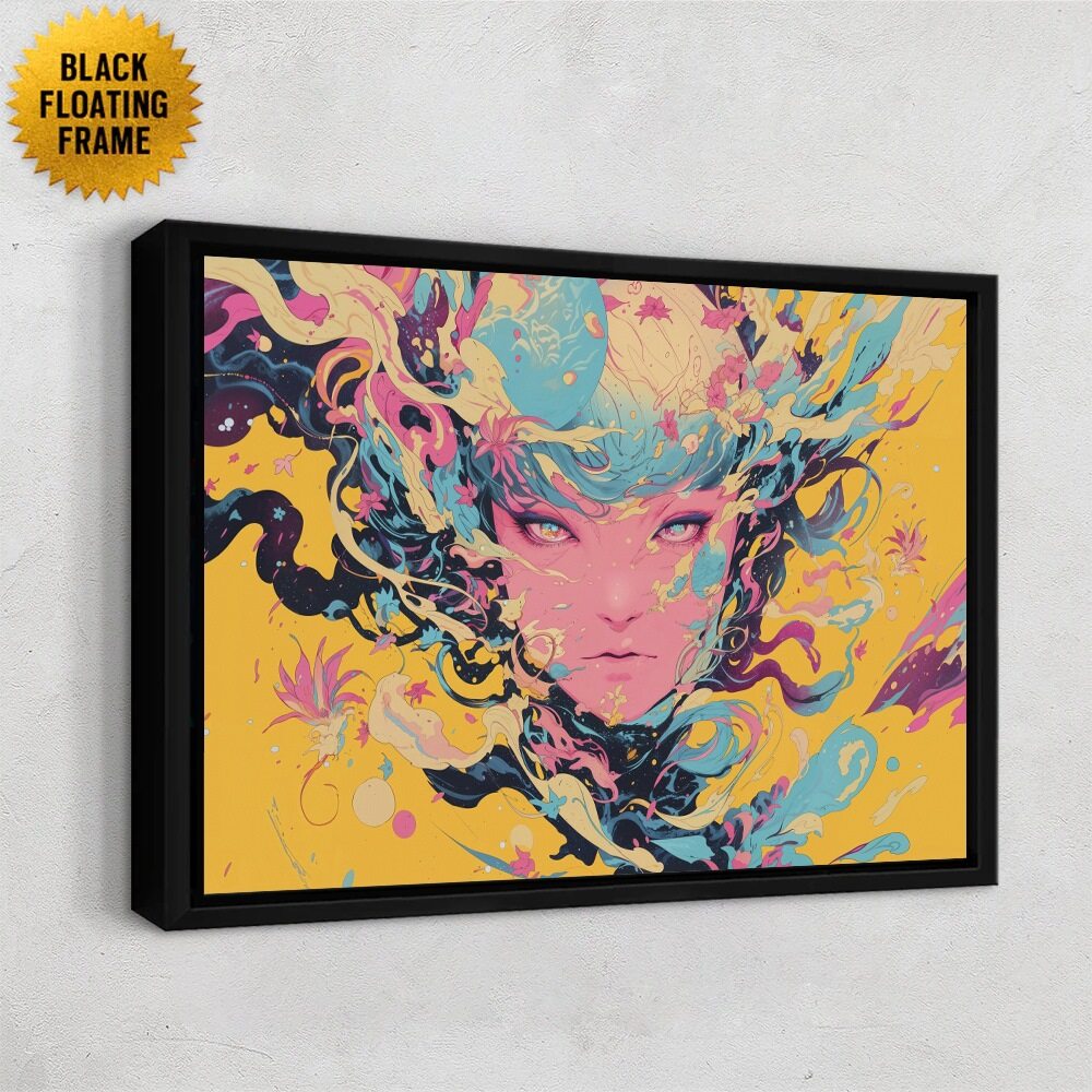 Colorful abstract art print with a black floating frame on a white wall.