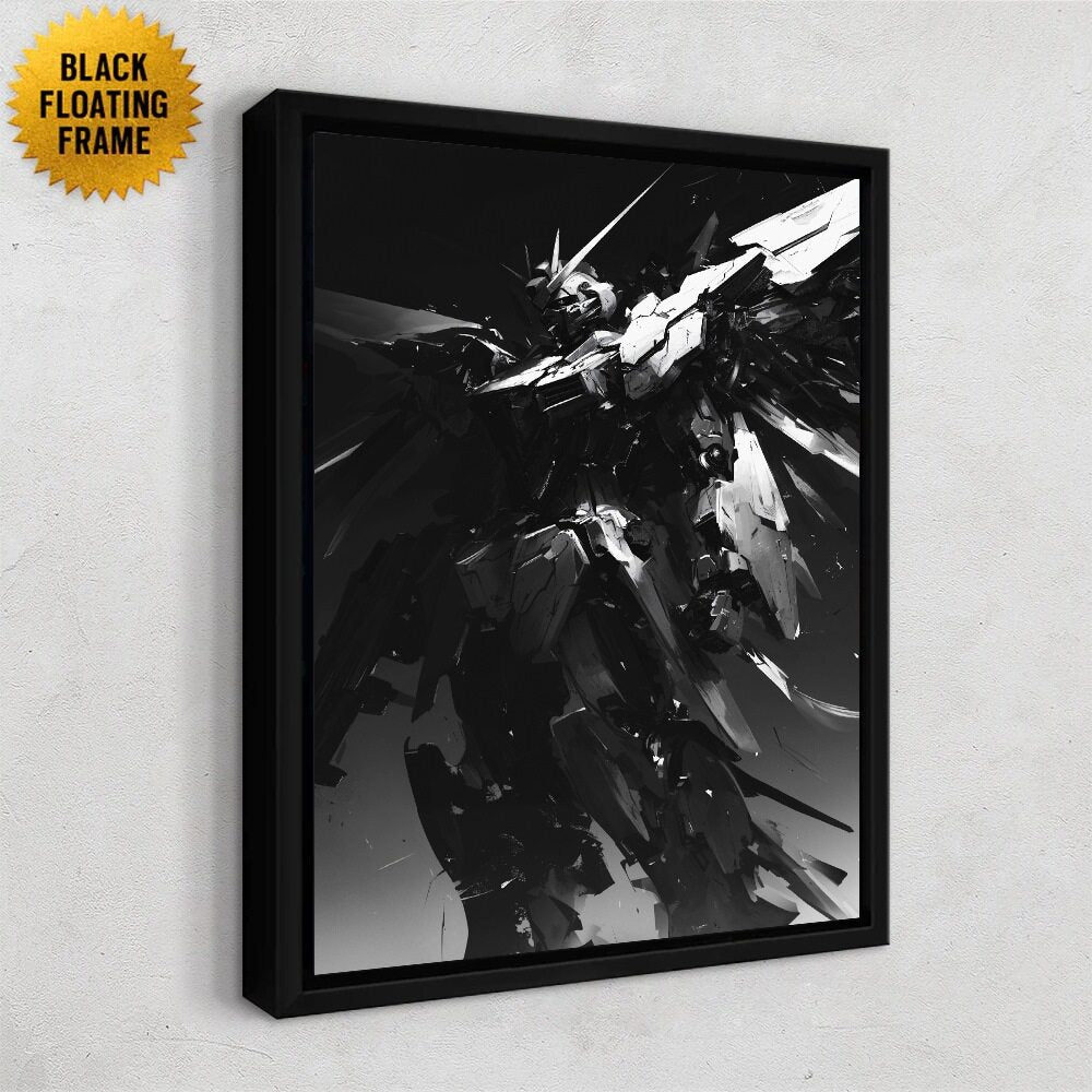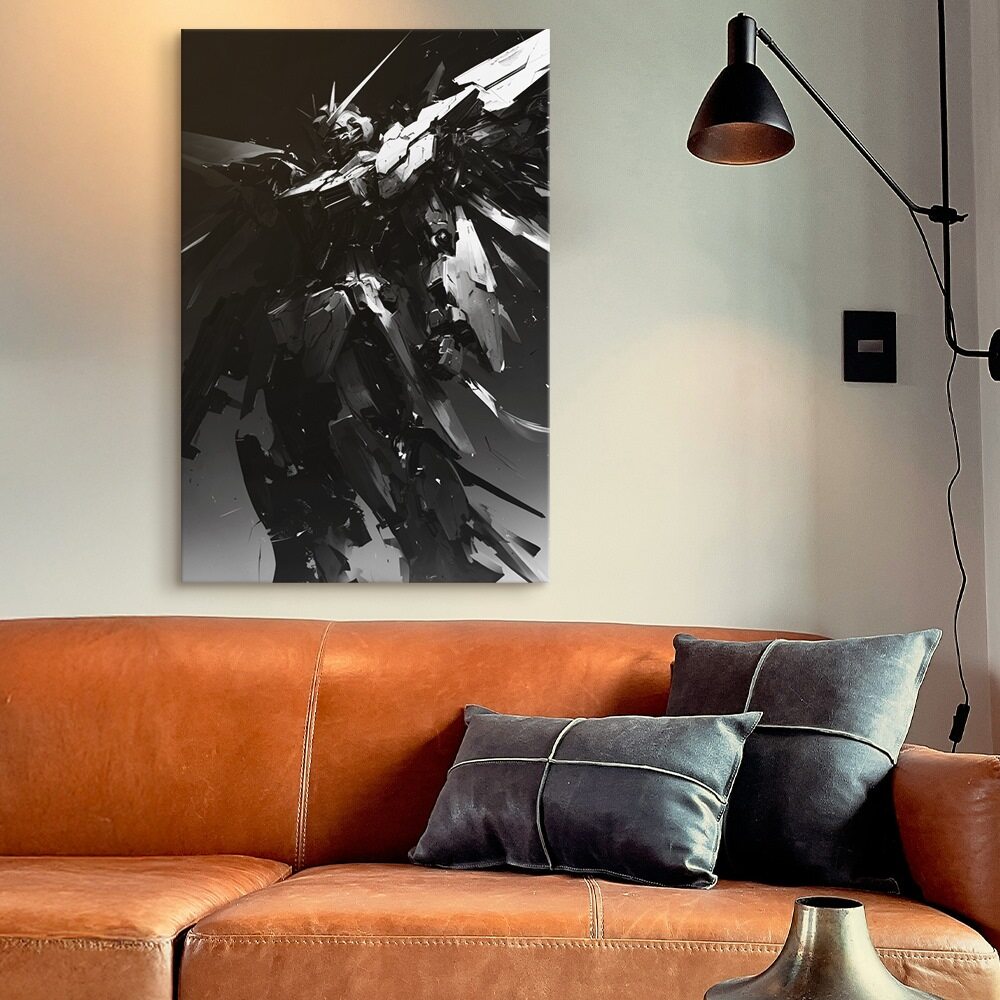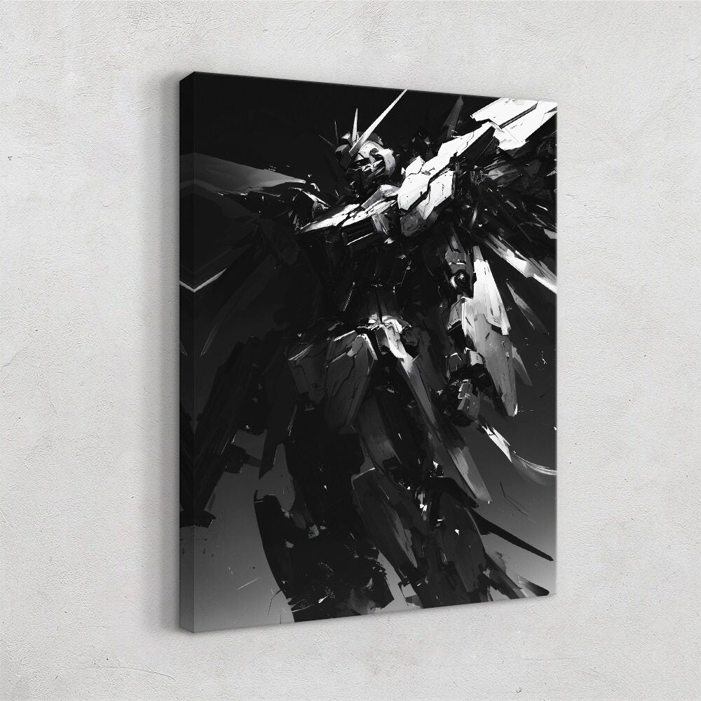 A towering monochrome mecha emerges from swirling darkness, its angular armor fragmented like shards of obsidian. The machine’s silhouette is sharp and imposing, partially illuminated by slashes of light that carve out its jagged form. Despite being mechanical, the figure carries an almost mythic presence—part warrior, part shadow, part storm. The composition feels frozen mid-motion, as if the mecha is descending or rising from an unknown void. Dramatic contrast emphasizes its immense scale, power, and enigmatic purpose.