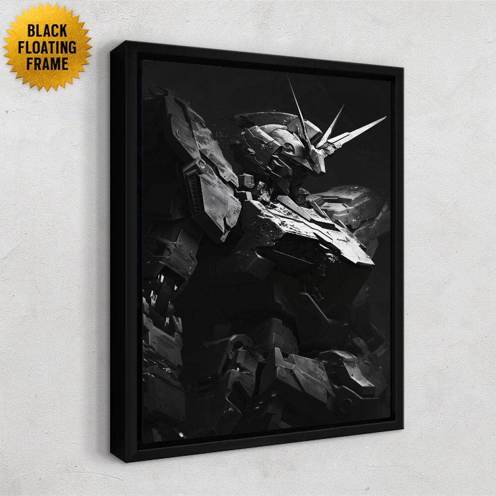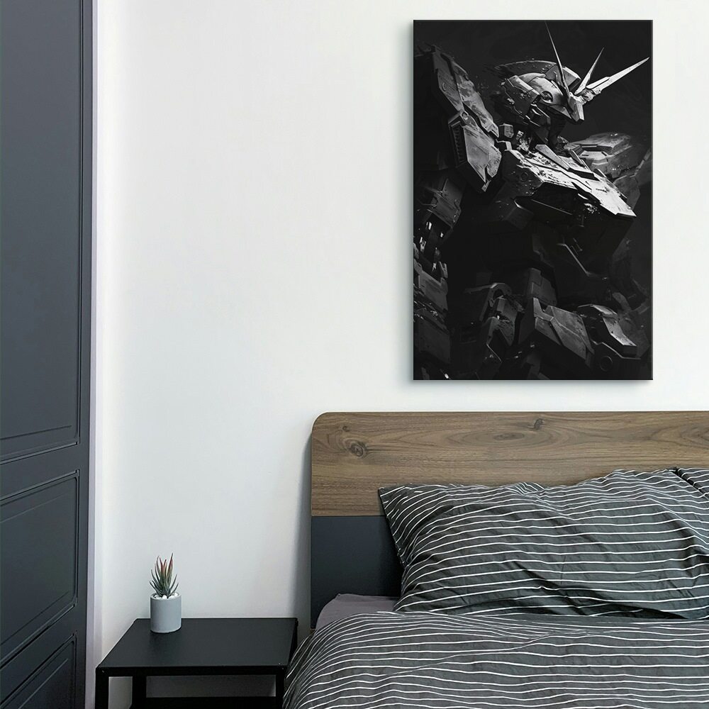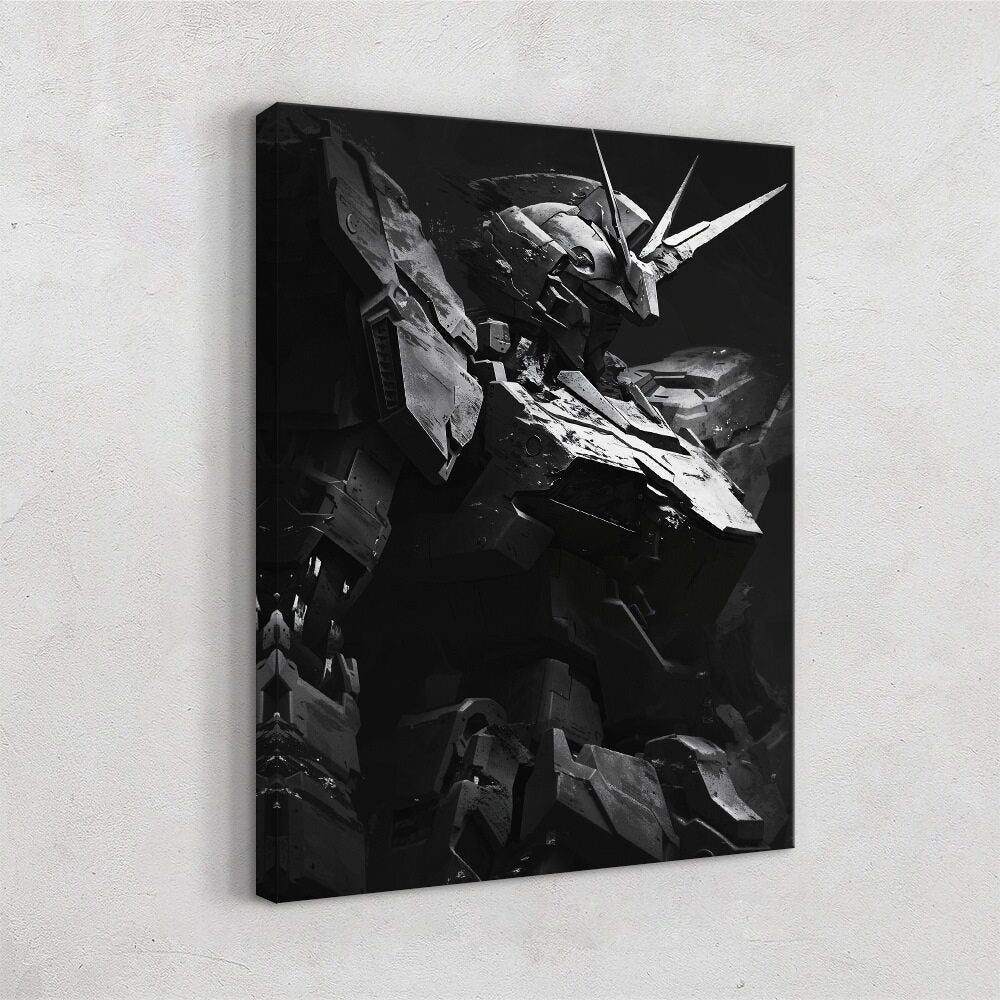 A towering, battle-worn mech stands in dramatic low-light, its armored plating cracked and scarred from combat. Sharp angular horns rise from its helmet, giving the machine an intimidating, almost knight-like silhouette. Rendered in monochrome, the artwork emphasizes deep shadows and metallic textures that make the mech appear as though it is emerging from darkness. The pose is rigid and imposing, embodying silent vigilance and immense power—an evolution of the Mecha Shadow series, darker and more resolute.