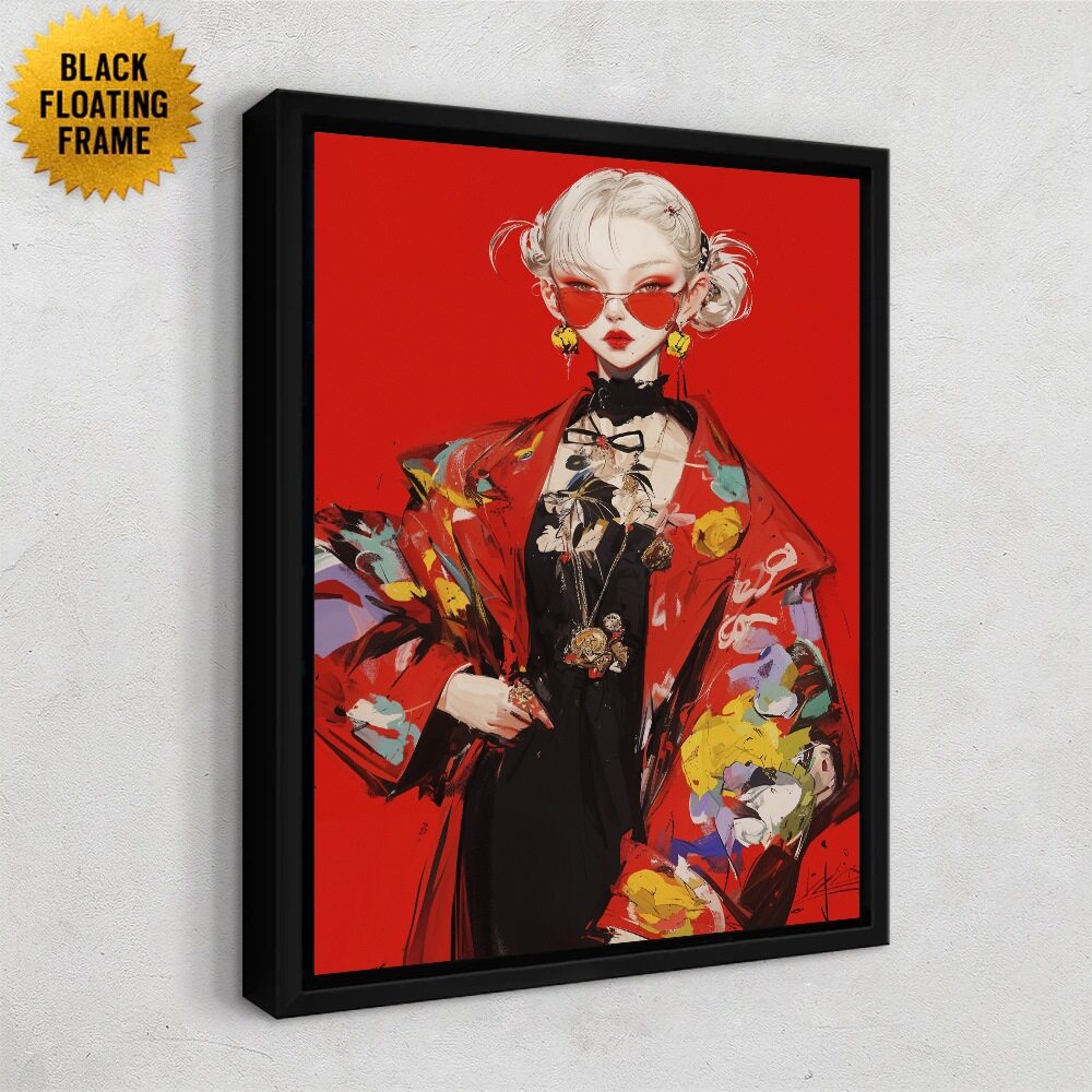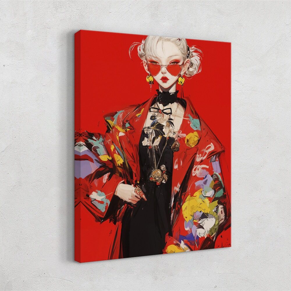 A bold contemporary fashion illustration featuring a striking woman dressed in a dramatic red palette. She wears oversized red sunglasses, bright red lipstick, and a voluminous patterned coat splashed with expressive brushstrokes of yellow, blue, black, and white. Her platinum-blonde hair is styled in two elegant buns, and her black dress is adorned with ornate jewelry and floral embellishments. Set against a vivid solid-red background, the artwork radiates fierce confidence, modern glamour, and high-fashion attitude—perfectly capturing the persona of “Miss Scarlet.”