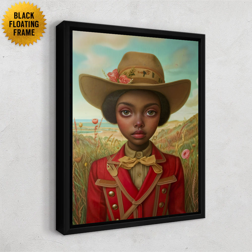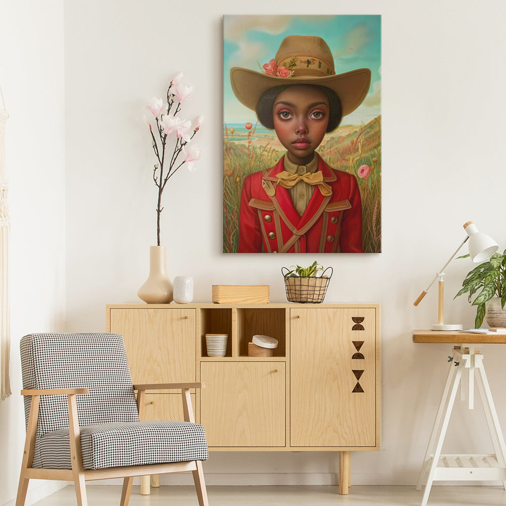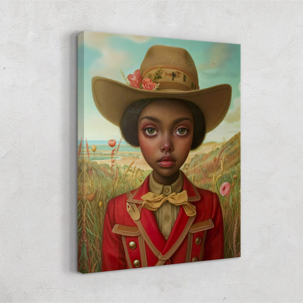 A young girl stands in a sunlit prairie landscape, dressed in a vivid red Western-style outfit adorned with gold trim and a large yellow bow. She wears a wide-brimmed cowboy hat decorated with painted cacti and fresh roses tucked into the band. Her expression is calm and steady, with large, reflective eyes and softly illuminated skin. Behind her stretches a pastoral frontier scene—rolling grasses, distant hills, wildflowers, and a glimpse of blue water meeting the horizon. The portrait blends whimsical realism with vintage Americana, evoking themes of exploration, innocence, and the mythic pull of the West.