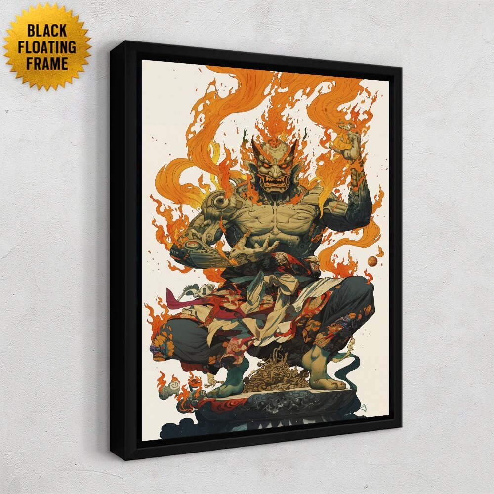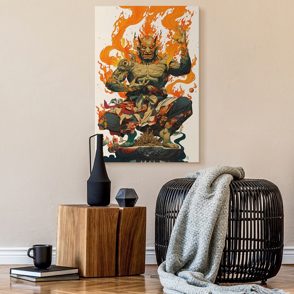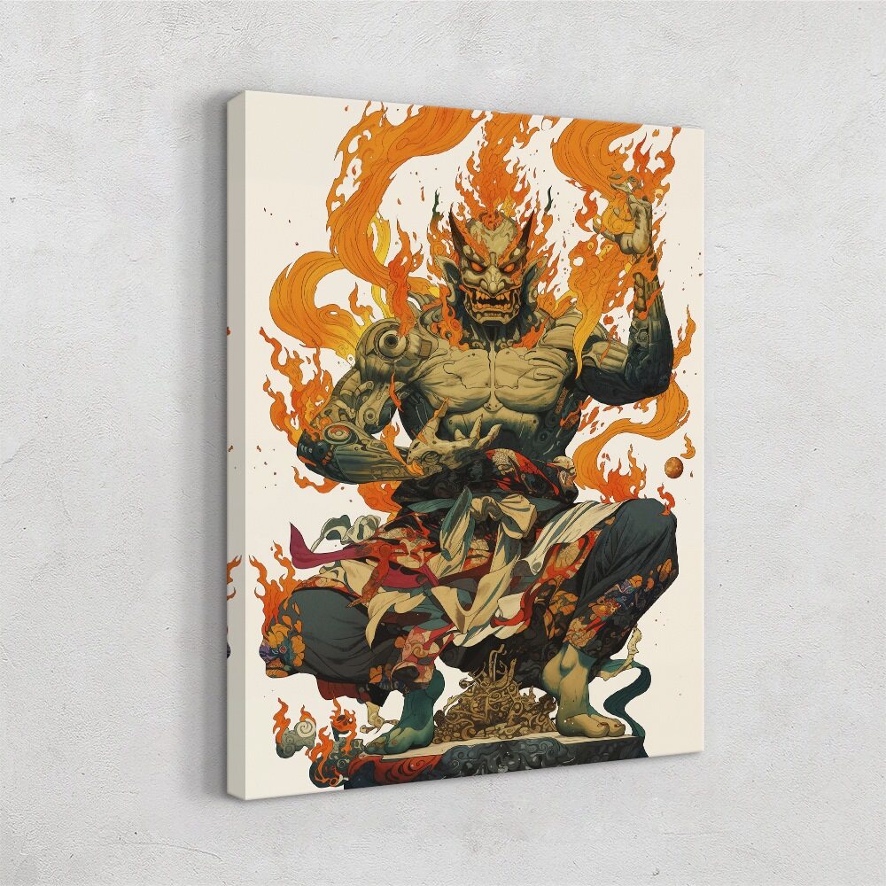 A powerful, demonic figure sits cross-legged atop an ornate pedestal, engulfed in sweeping orange flames. His muscular, tattooed body is partially wrapped in patterned cloth, and his snarling face features sharp fangs and curved horns. The artwork blends mythic and fantasy elements with detailed linework and vibrant orange fire motifs, emphasizing the intensity and supernatural presence associated with the title Orange Demon.