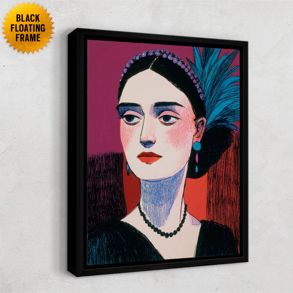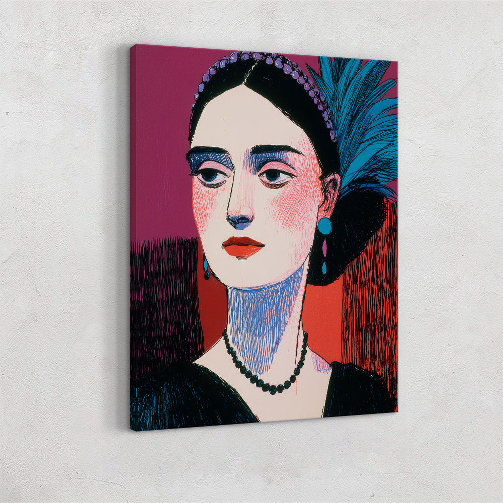 Painted Showgirl I is a stylized portrait of a poised woman rendered in bold, painterly strokes and graphic color blocks. She faces slightly to the side with a calm, self-possessed expression, her features elongated and elegant. A deep magenta and warm red background contrasts with her pale skin, dark hair, and striking blue feathered headpiece. Accents like a beaded necklace and earrings add a theatrical, vintage glamour, evoking the atmosphere of a cabaret performer captured mid-pose—confident, composed, and quietly luminous.
