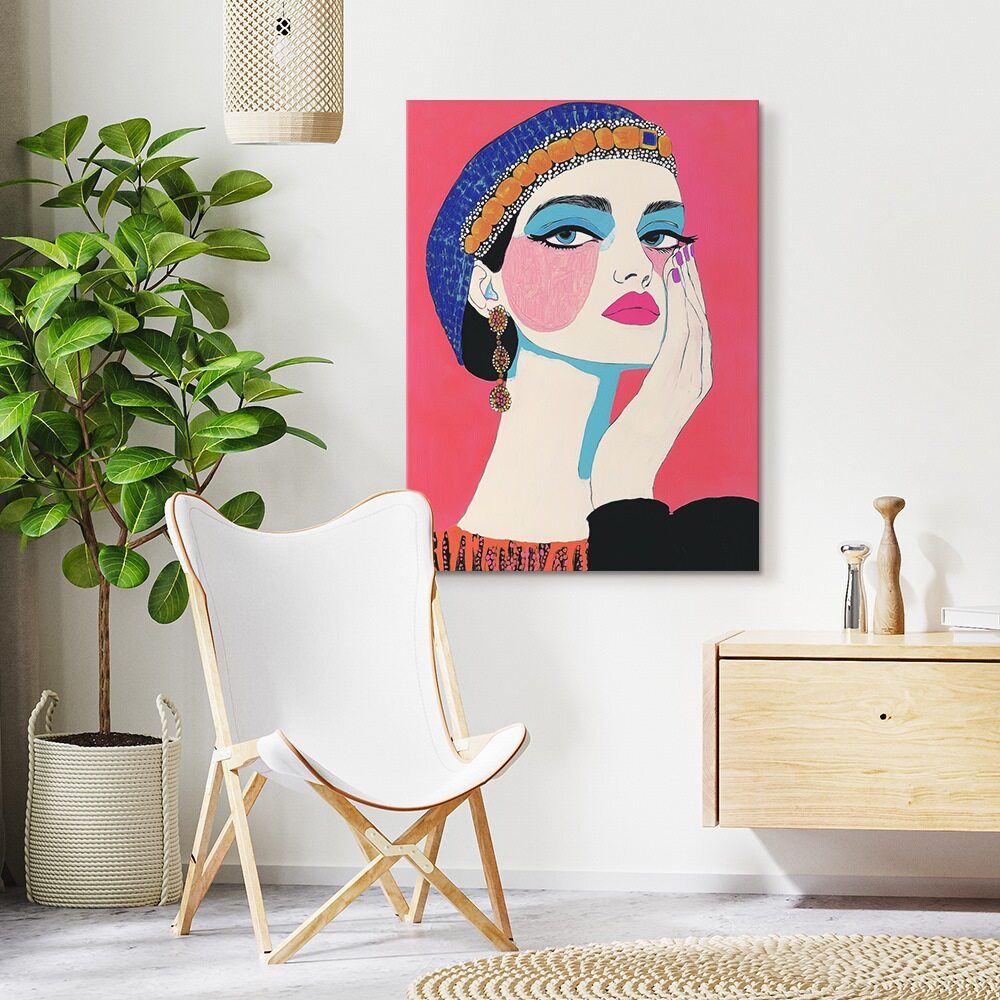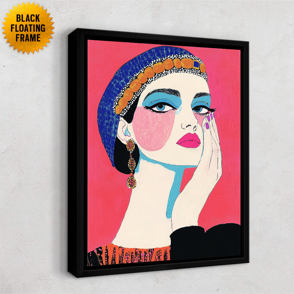 A bold, graphic portrait of a showgirl rendered in vibrant, high-contrast colors. Her stylized face features dramatic turquoise eye shadow, rosy pink cheeks, and glossy magenta lips, framed by a deep blue headpiece adorned with warm amber-like beads. She rests her hand against her cheek in a poised, contemplative gesture, while ornate earrings and patterned clothing add theatrical elegance. The saturated pink background heightens the sense of glamour, performance, and self-aware artistry, evoking a modern, painted interpretation of classic showgirl allure.