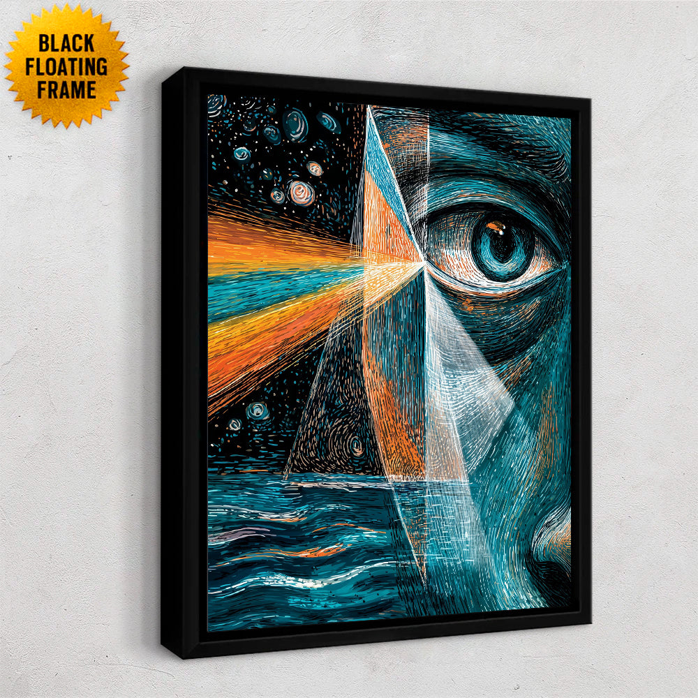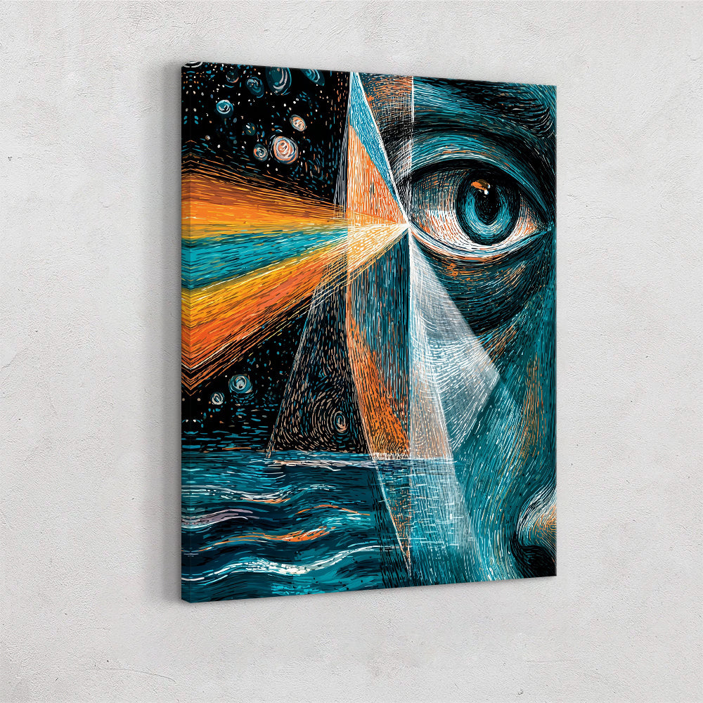 Prism Dream II presents a surreal, close-cropped portrait where a single eye becomes a gateway between inner consciousness and the cosmos. Angular prisms of light slice through the composition, refracting warm oranges and cool blues into a dreamlike convergence of sea, sky, and starlight. The image feels both introspective and expansive, evoking perception as something fractured yet luminous—where emotion, memory, and imagination collide through vision itself.