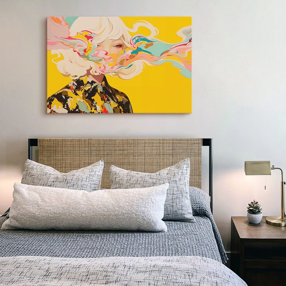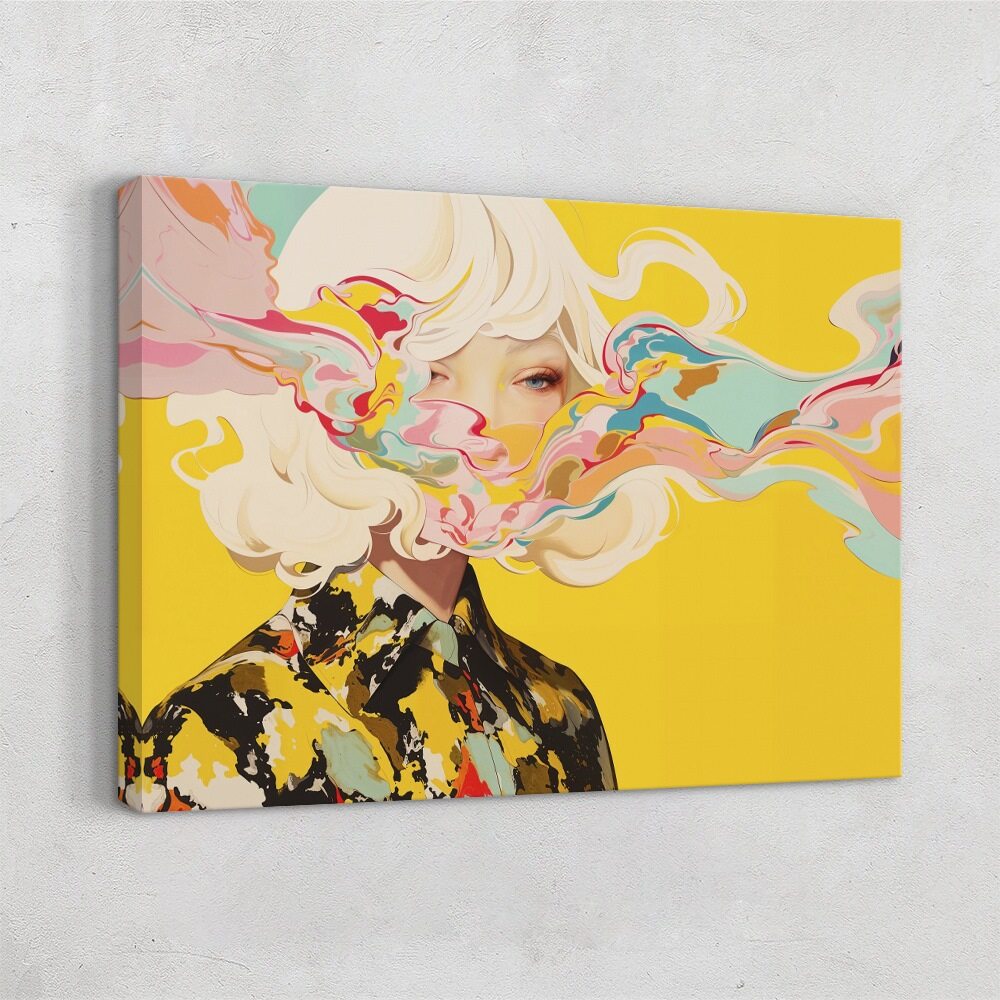 A surreal portrait of a woman with platinum-blonde hair set against a bold yellow background. Her face is partially obscured by swirling ribbons of pastel paint that flow outward like thoughts escaping into the open. The abstract patterns contrast with her patterned clothing, creating a striking blend of fashion, emotion, and dreamlike introspection. The artwork evokes the idea of self-reflection as something fluid, colorful, and ever-changing.