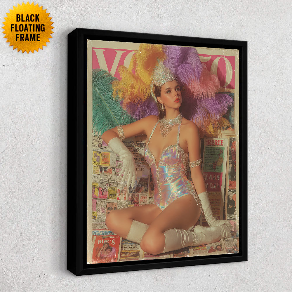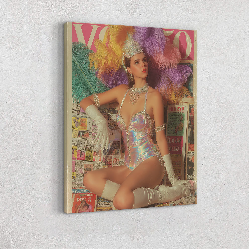 Vintage-inspired showgirl in an iridescent bodysuit and feathered headdress, posing against a backdrop of old newspapers with theatrical elegance.