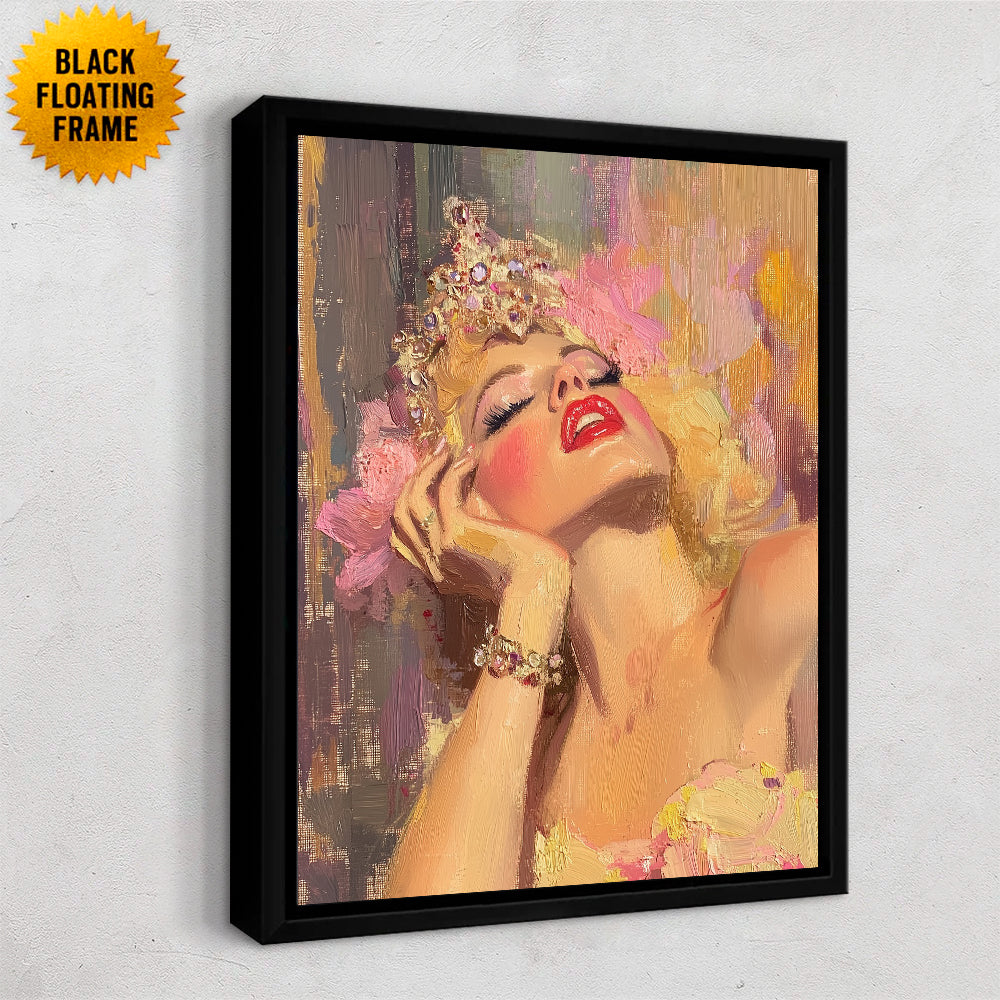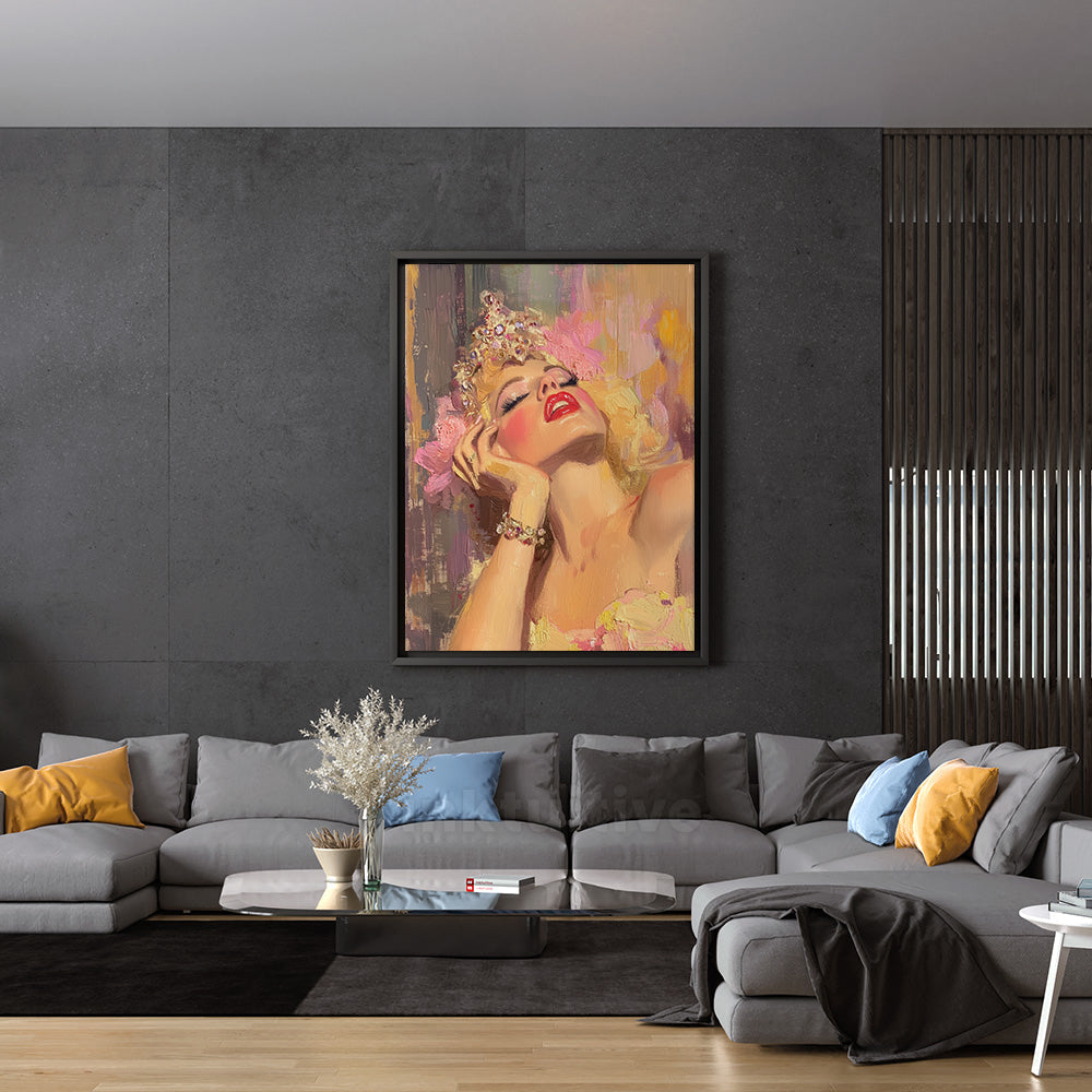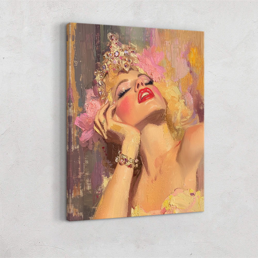 A luminous showgirl reclines in a moment of decadent stillness, her head tilted back as warm light washes over her flushed cheeks and parted lips. A jeweled crown glimmers against soft, painterly textures, while loose brushstrokes of pink, gold, and lavender create an atmosphere of glamour and vulnerability. The composition captures the quiet aftermath of performance—where radiance lingers, and confidence softens into reverie.
