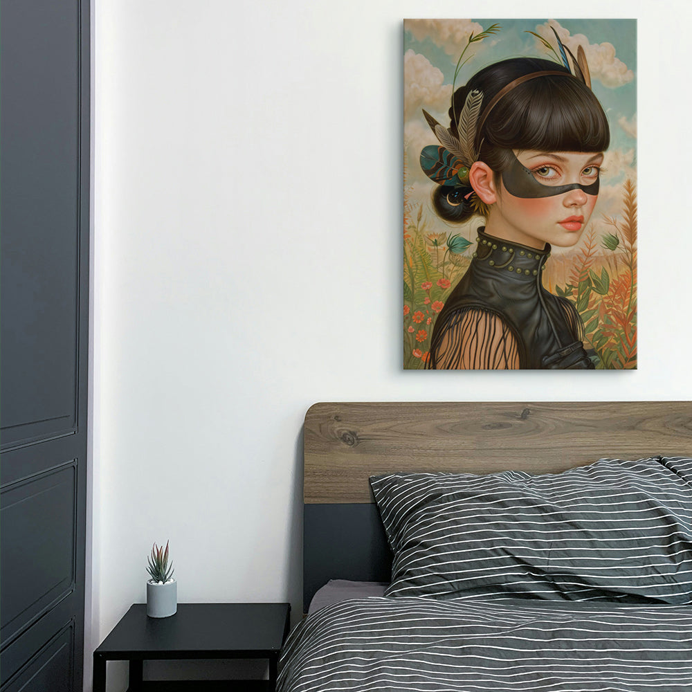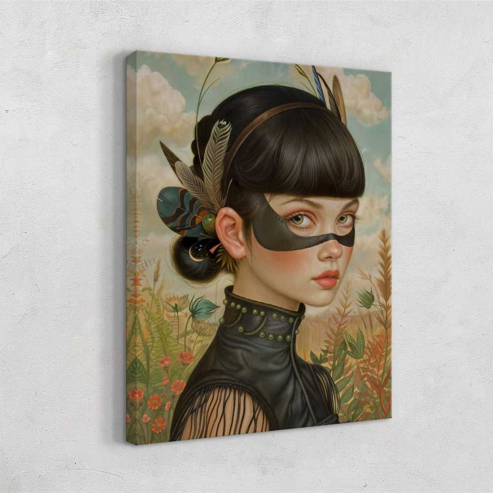 A young girl stands in a sunlit field, dressed in a sleek black outfit adorned with studs and delicate fringe. She wears a small black eye mask that gives her the look of a mysterious outlaw. Her dark hair is styled into an elegant updo decorated with layered feathers in earthy tones. Soft clouds and wildflowers fill the background, contrasting her poised, enigmatic presence. Her gaze is calm but sharp, capturing the blend of innocence and rebellion that defines "The Bandit."