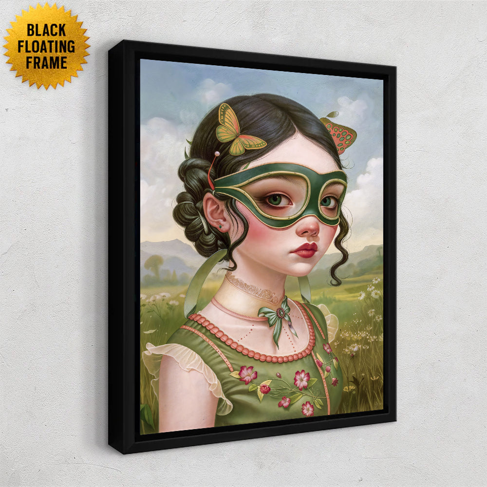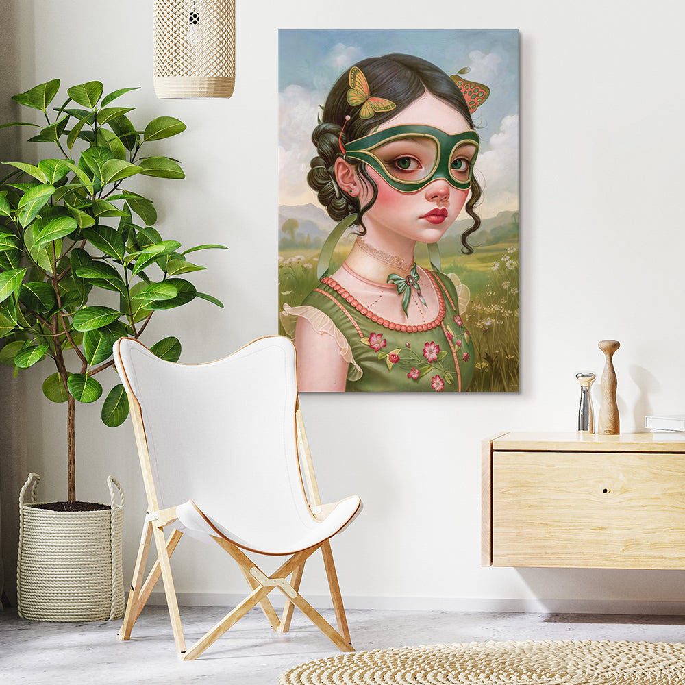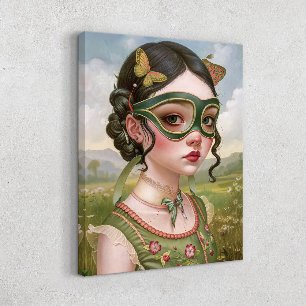 A young girl stands in a dreamy meadow, wearing an ornate green mask shaped like butterfly wings. Her delicate features are framed by dark curls pinned with real butterflies, blending nature with whimsy. Dressed in a soft green dress embroidered with flowers and trimmed with lace, she exudes an air of innocence and quiet mystery. The pastel sky, rolling hills, and fluttering butterflies around her create a gentle, enchanted atmosphere, as though she inhabits a world where childhood imagination blends seamlessly with fairytale magic.