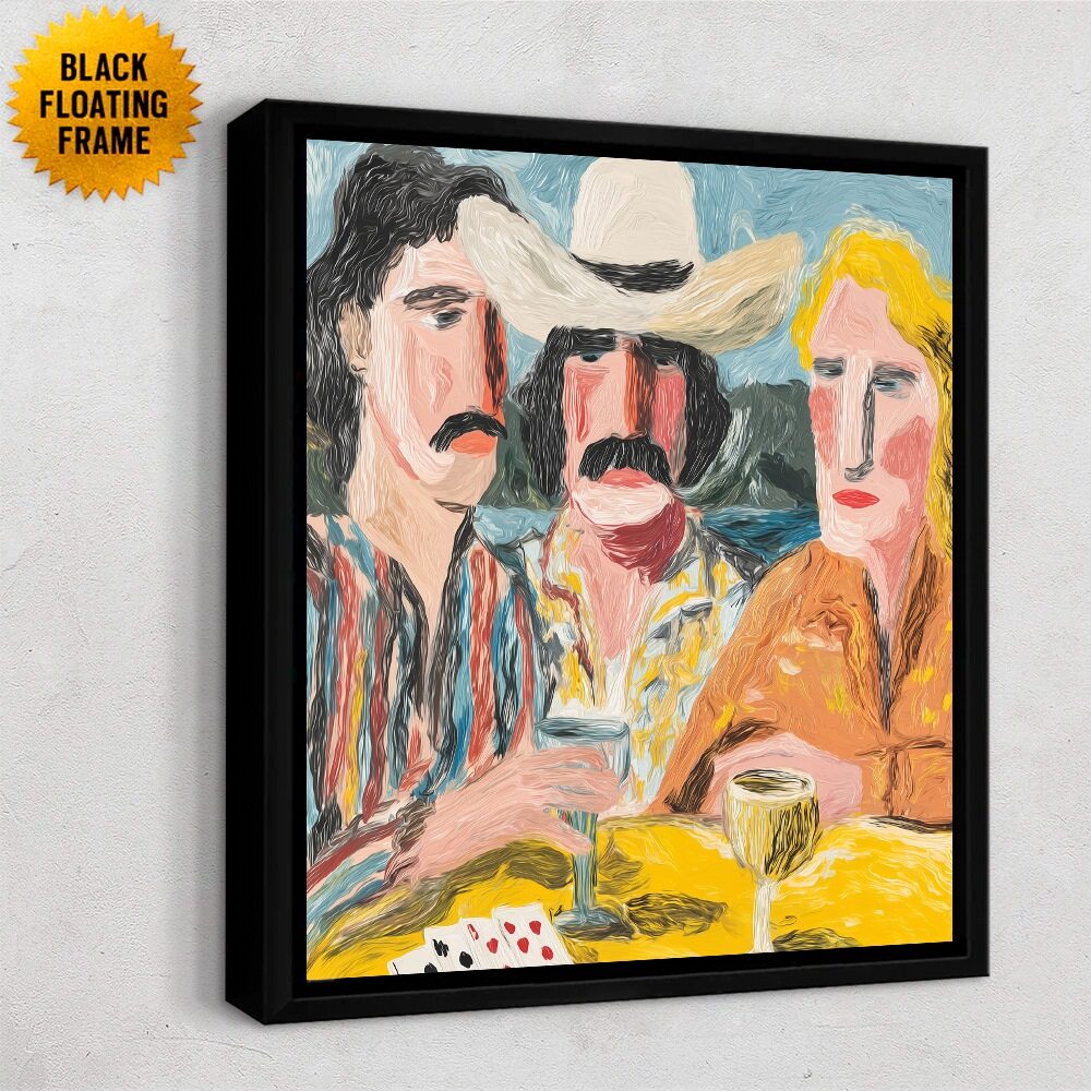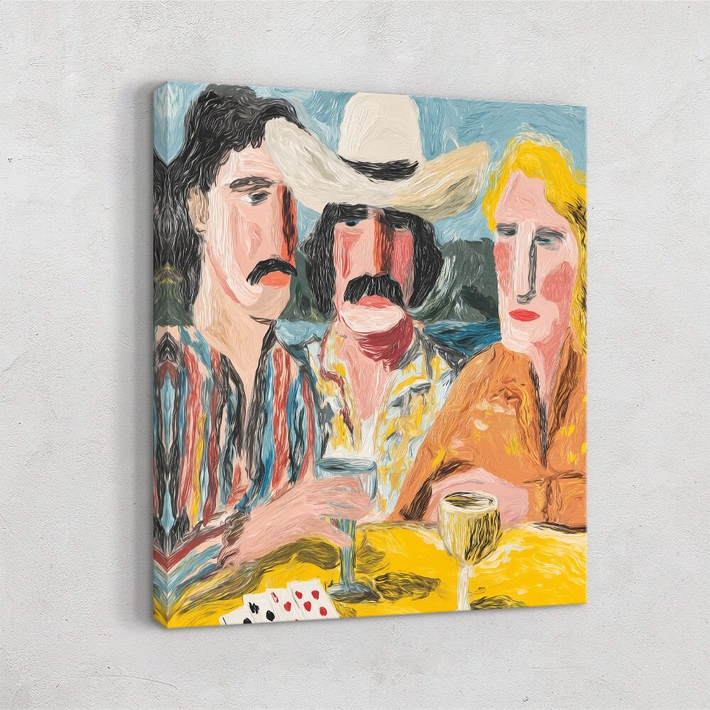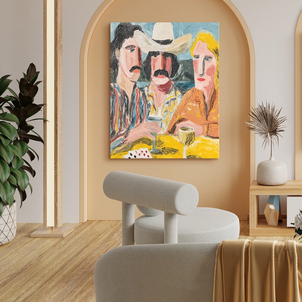 The Painted Hand I depicts three figures seated closely at a table, rendered in thick, expressive brushstrokes that emphasize texture and emotion over realism. Their faces are elongated and abstracted, marked by flushed reds and muted blues, suggesting weariness, intimacy, or quiet tension. One figure wears a wide-brimmed hat, another has dark hair and a mustache, and the third is softly lit with golden tones. Playing cards and glasses rest on the yellow tabletop, grounding the scene in a moment of shared stillness, while the painterly style gives the image a raw, contemplative atmosphere.