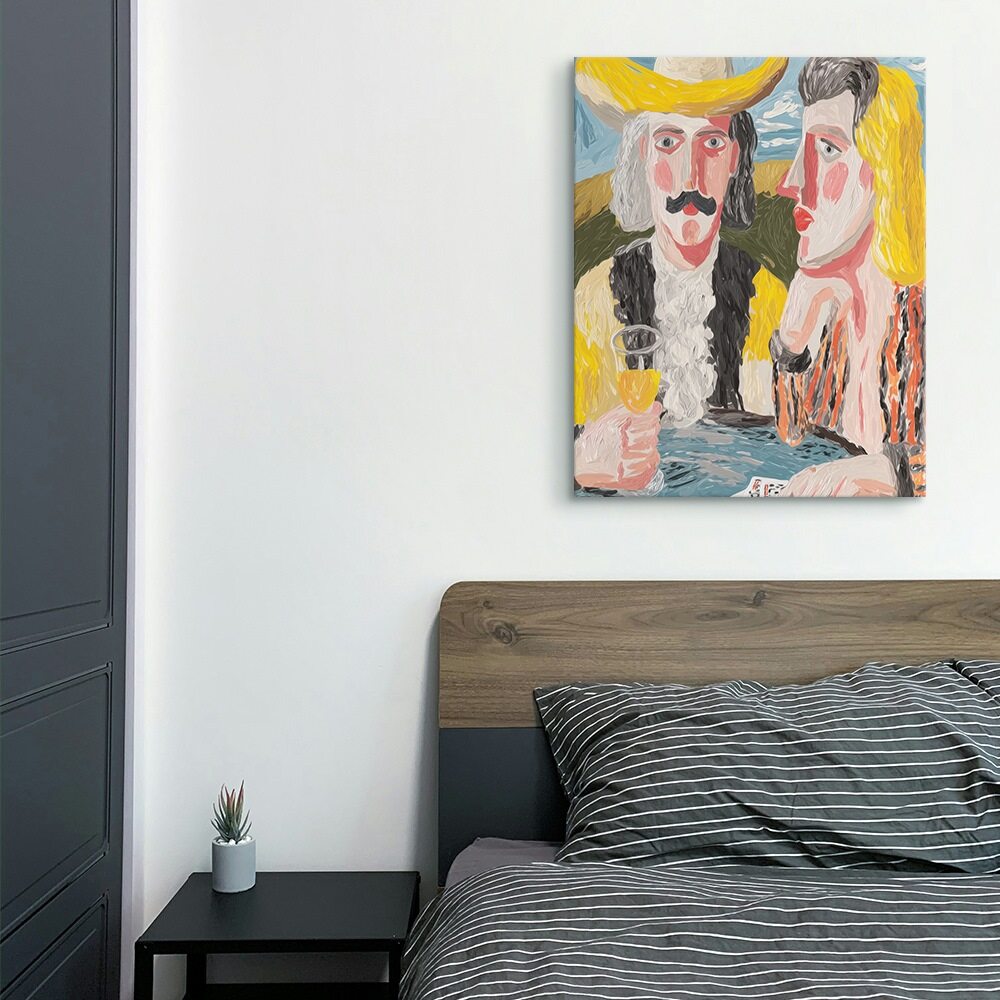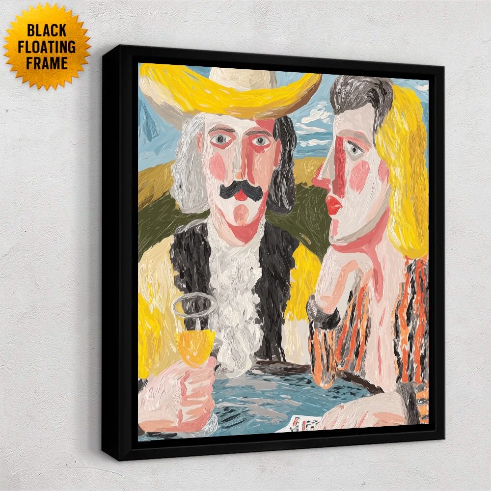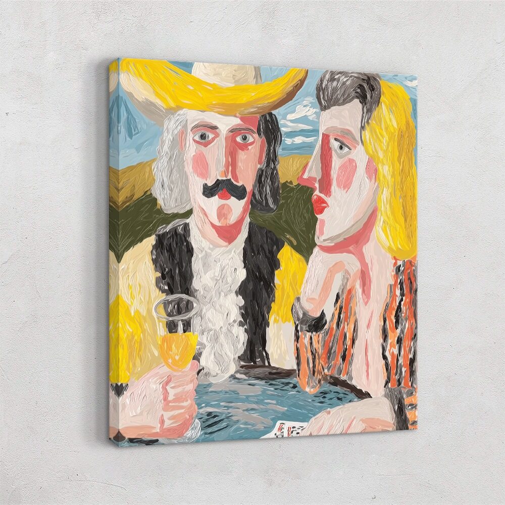 A boldly expressive, folk-inspired painting depicting two stylized figures seated at a table outdoors. Rendered in thick, visible brushstrokes and a naïve, painterly style, the figures feature exaggerated facial proportions, flushed cheeks, and simplified forms. One figure wears a wide yellow hat and holds a glass, while the other, with long blonde hair, turns in profile as if mid-conversation. The scene feels intimate yet slightly surreal, evoking themes of shared ritual, observation, and emotional distance through its raw color palette and intentionally imperfect execution.