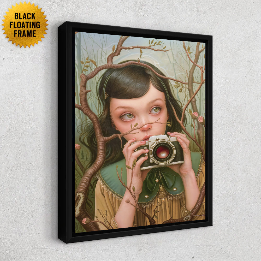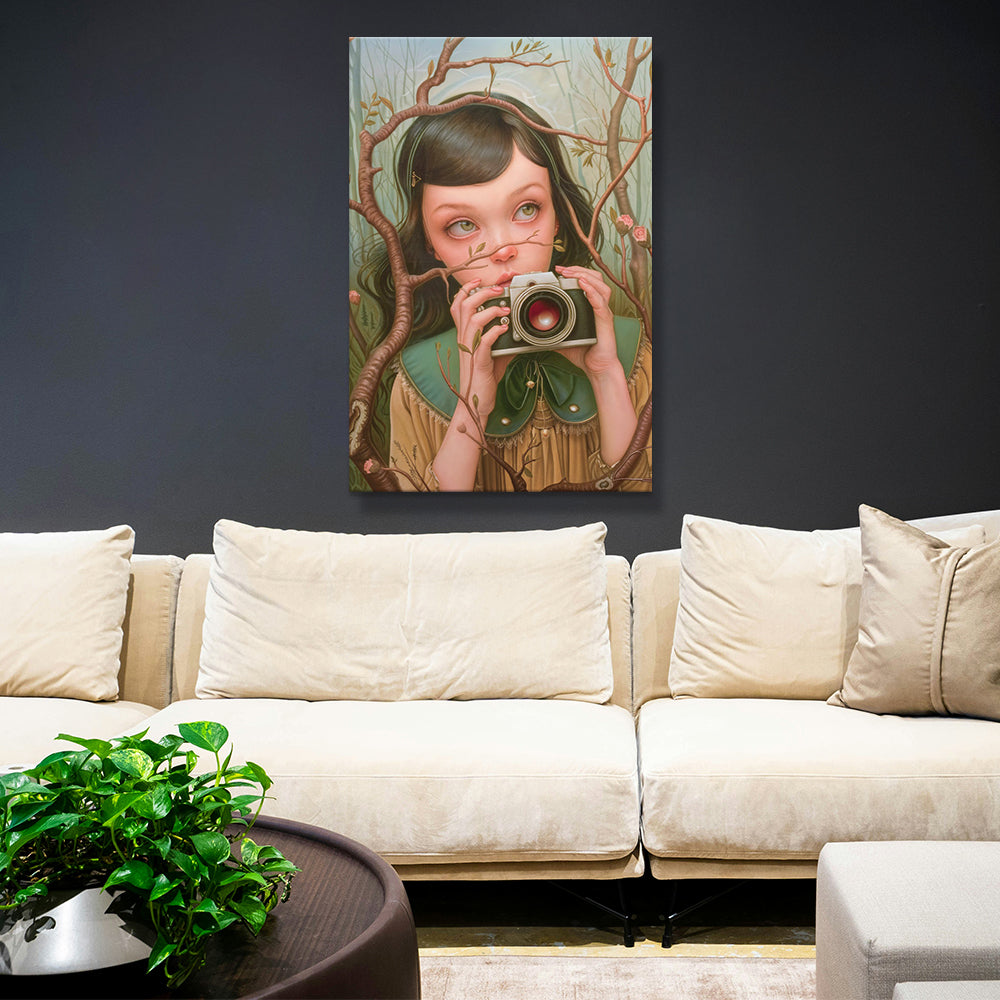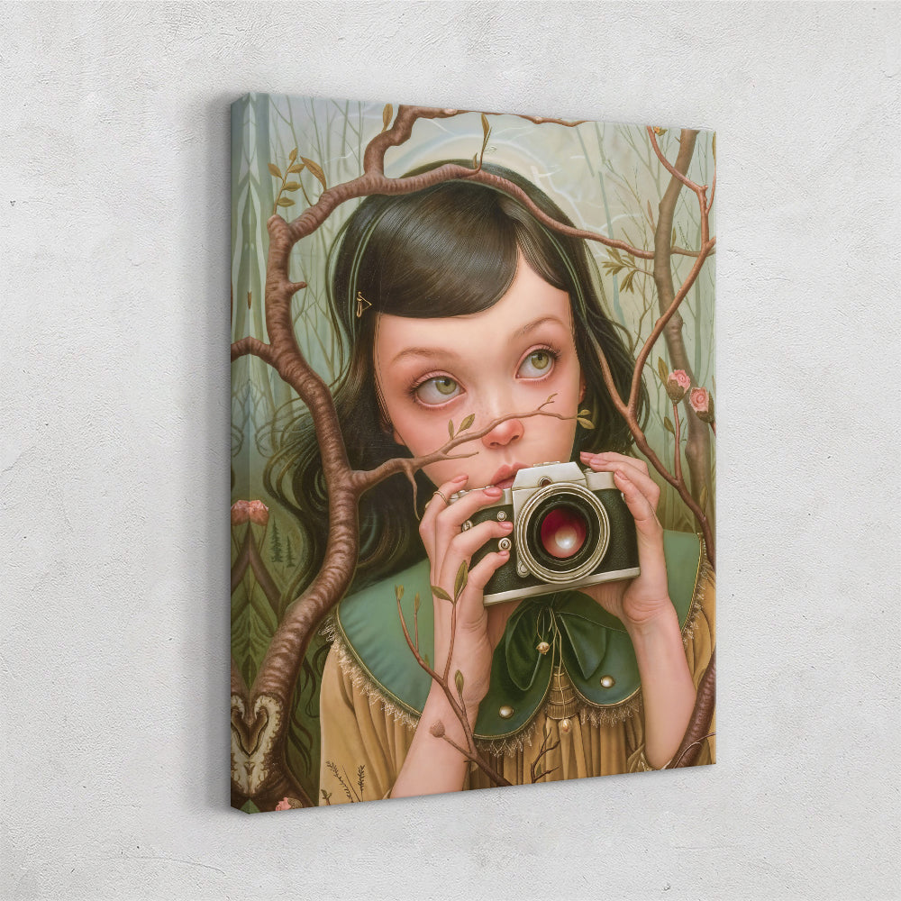 A delicate, surreal portrait of a young girl standing amidst a tangle of slender branches. She holds a vintage camera close to her face, as though caught in the act of capturing a hidden moment. Her wide, pale green eyes look upward with quiet curiosity, framed by soft features and wisps of dark hair. The scene feels dreamlike and intimate—nature encroaches gently around her, with small blossoms woven into the branches, hinting at themes of observation, wonder, and the fragile boundary between the observer and the natural world.