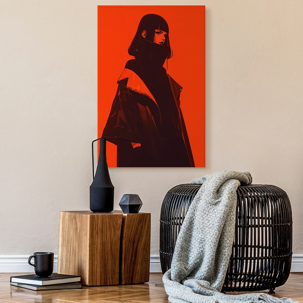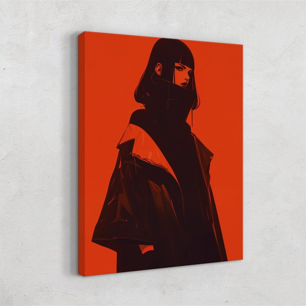 “The Red Visitor” depicts a mysterious figure standing against an intense, monochromatic red backdrop. Cloaked in a high-collared black coat with sharp, angular silhouettes, the figure exudes quiet confidence and menace. Only part of their face is visible—an observant eye peering out from beneath sleek, blunt black hair—enhancing the sense of someone who arrives unannounced, unreadable, and impossible to ignore. The minimalist composition and dramatic lighting heighten the figure’s enigmatic presence, making them feel like a silent omen or a stranger passing through with unknown intent.