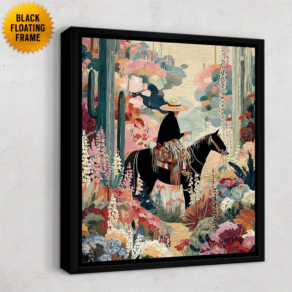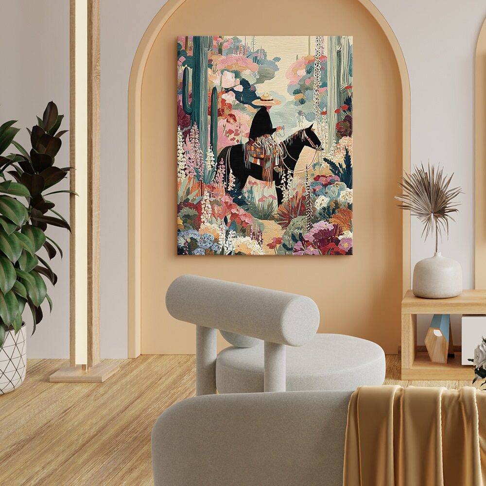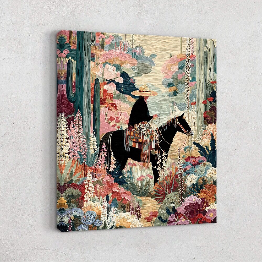 Western Whisper I presents a quiet, contemplative moment in a richly textured desert landscape. A lone rider on horseback pauses among towering cacti and blooming desert plants, rendered in soft pastels and tapestry-like patterns. The scene feels hushed and introspective, blending Western iconography with a dreamlike, almost folkloric atmosphere that emphasizes solitude, stillness, and the unspoken dialogue between rider and land.