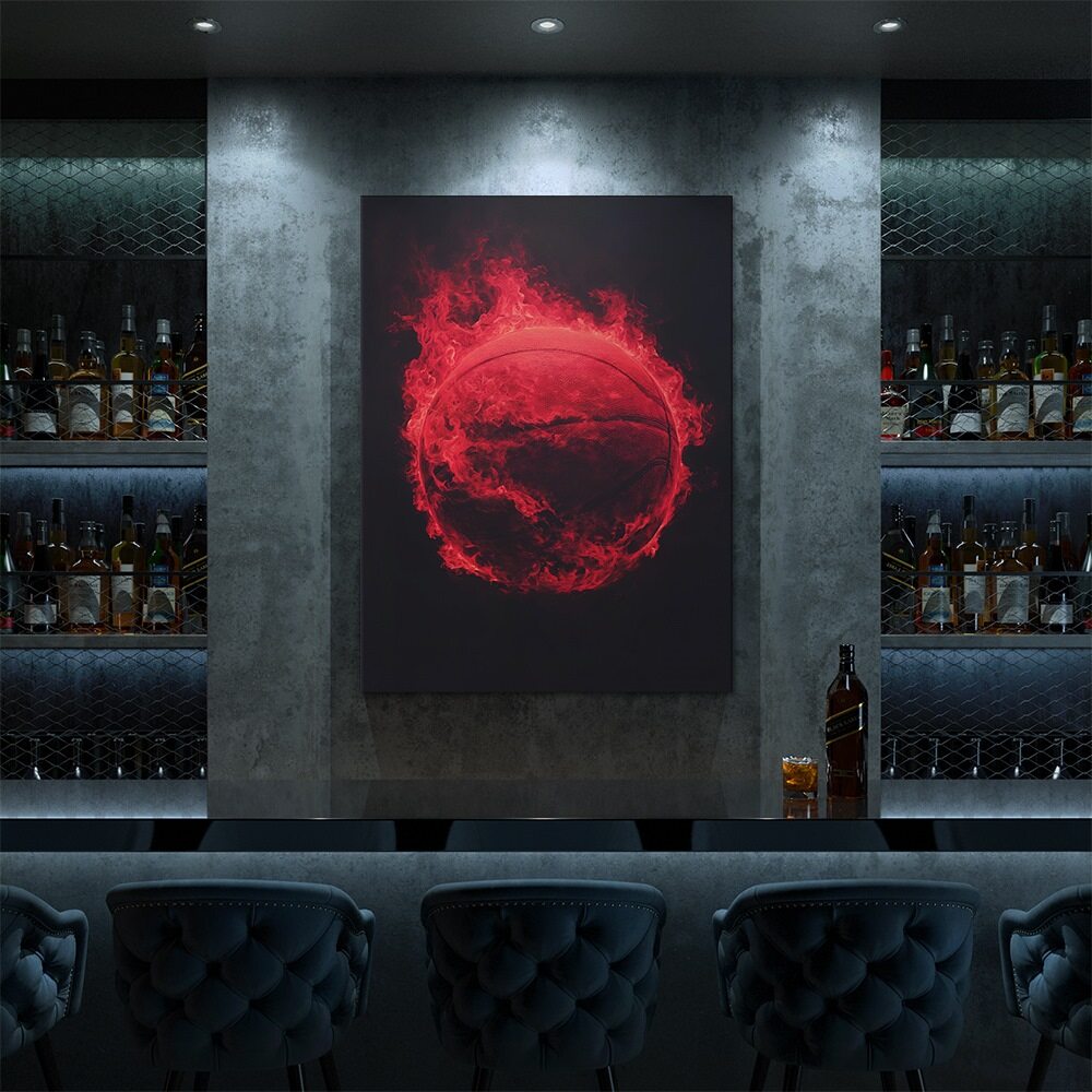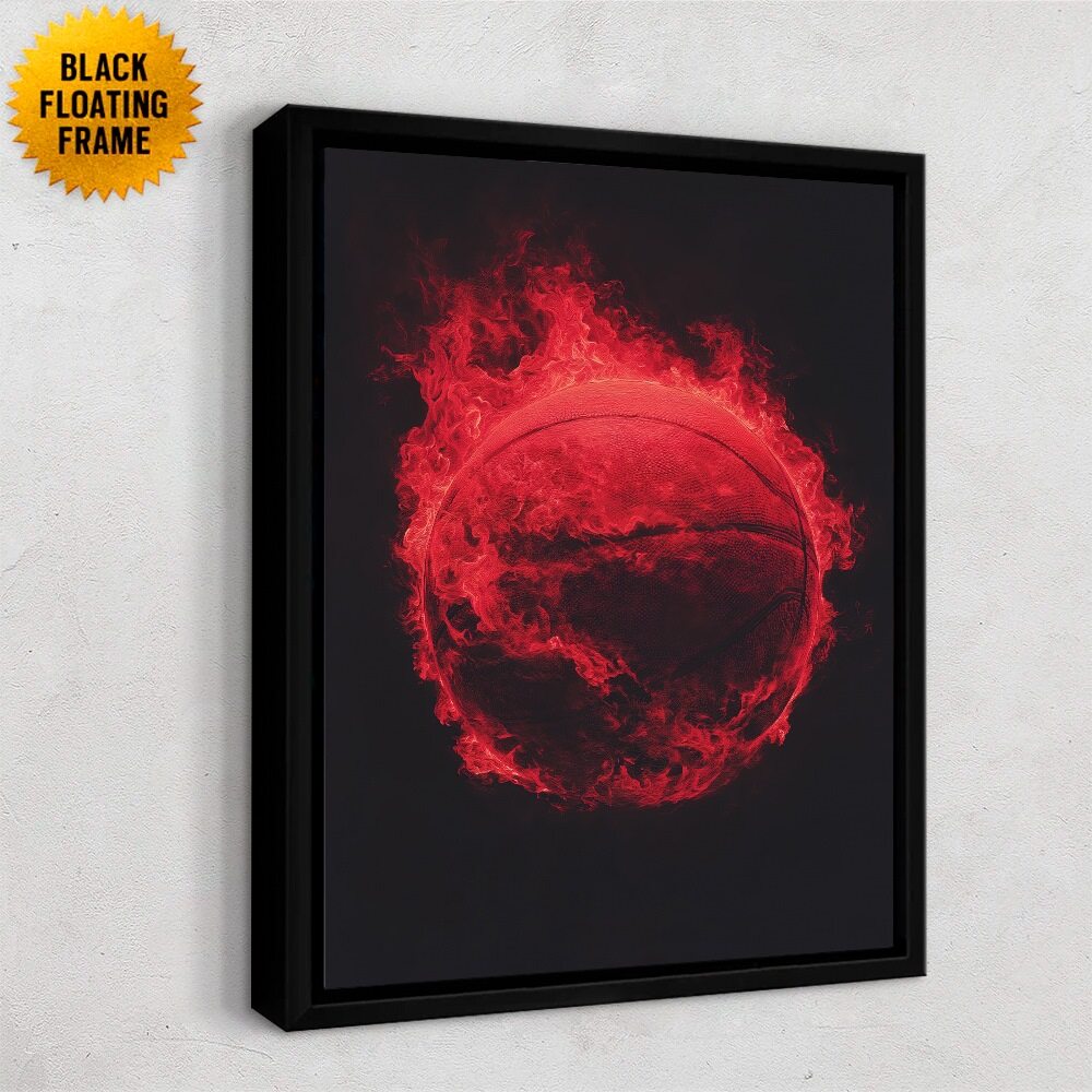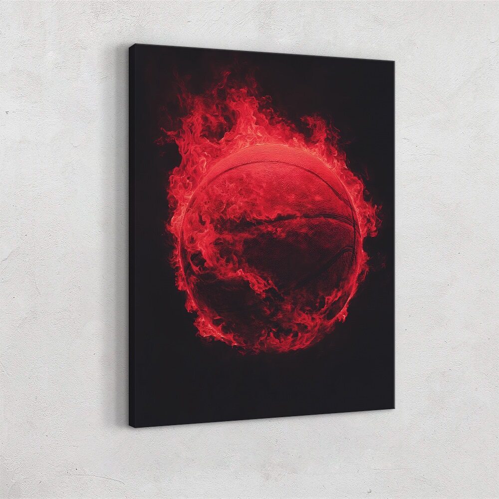 A dramatic, stylized image of a basketball engulfed in vivid red flames, glowing against a deep black background. The fire wraps tightly around the ball, suggesting intensity, power, and unstoppable momentum, with embers and heat radiating outward.