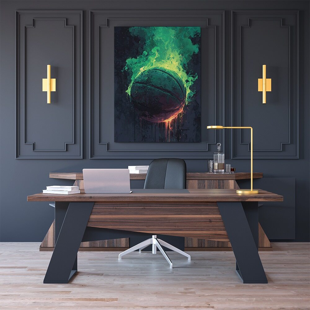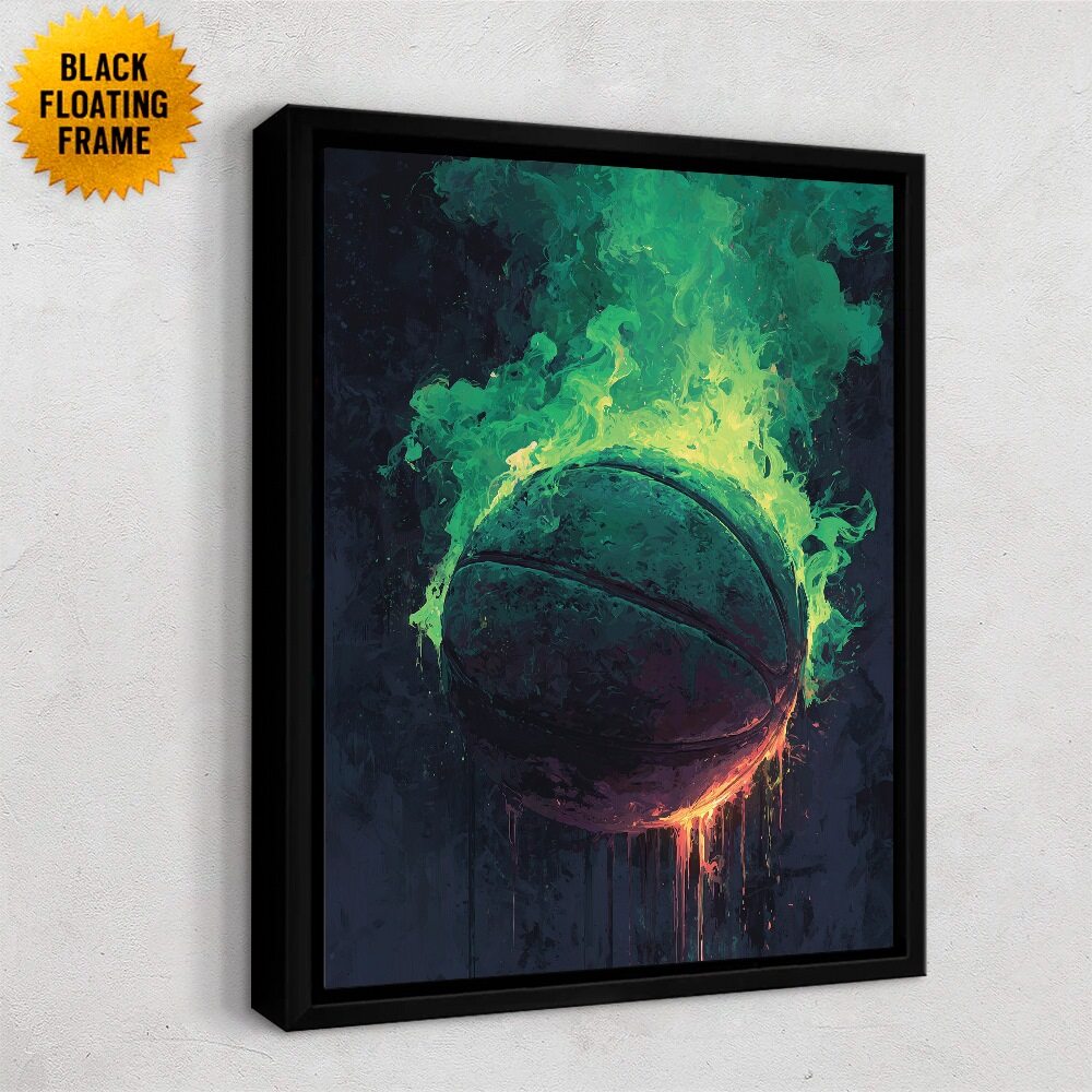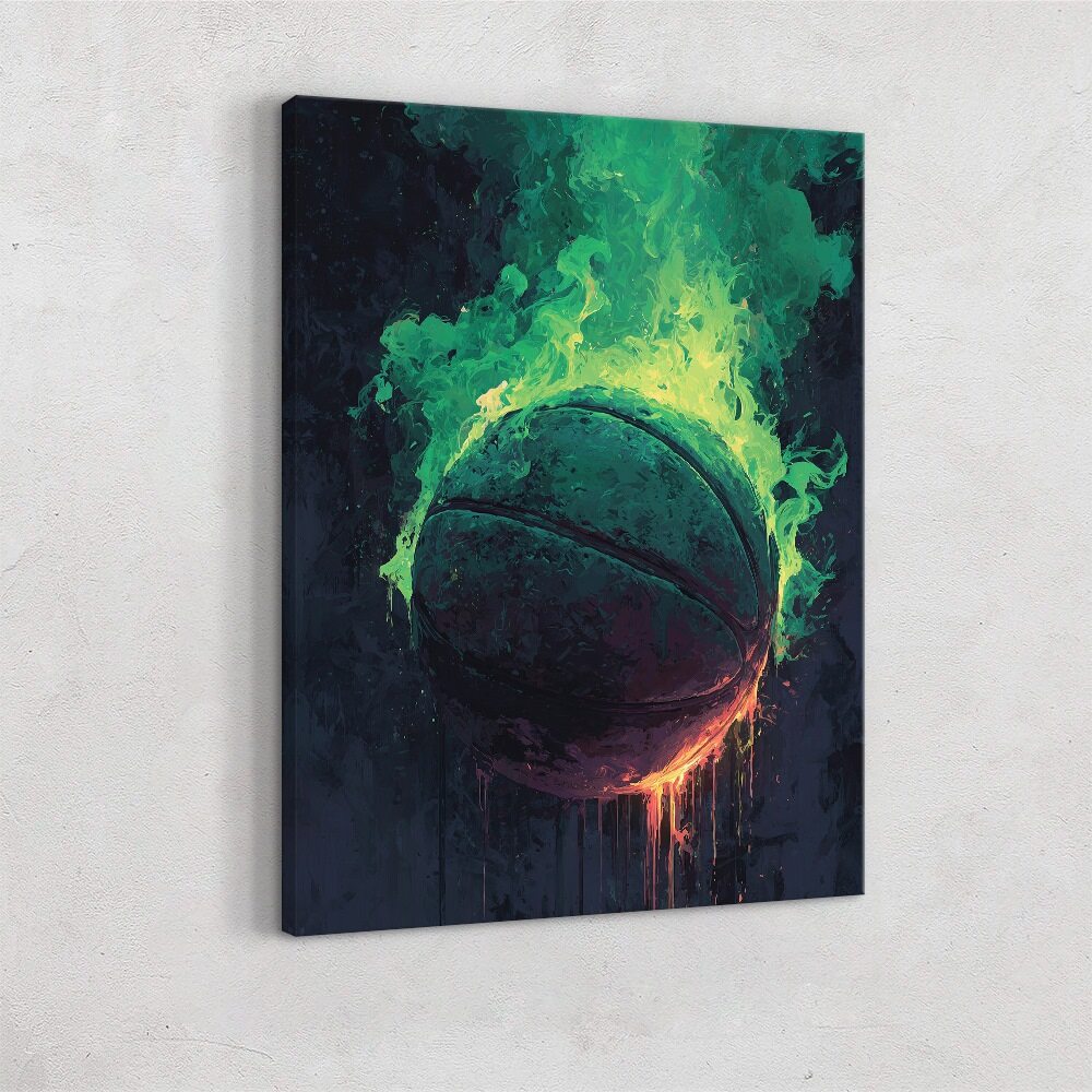 A dark, atmospheric illustration of a basketball suspended in midair, engulfed in vivid green flames that trail upward like smoke. The ball appears scorched and molten, with glowing highlights and dripping textures against a shadowy, textured background, creating a sense of intensity, energy, and transformation.