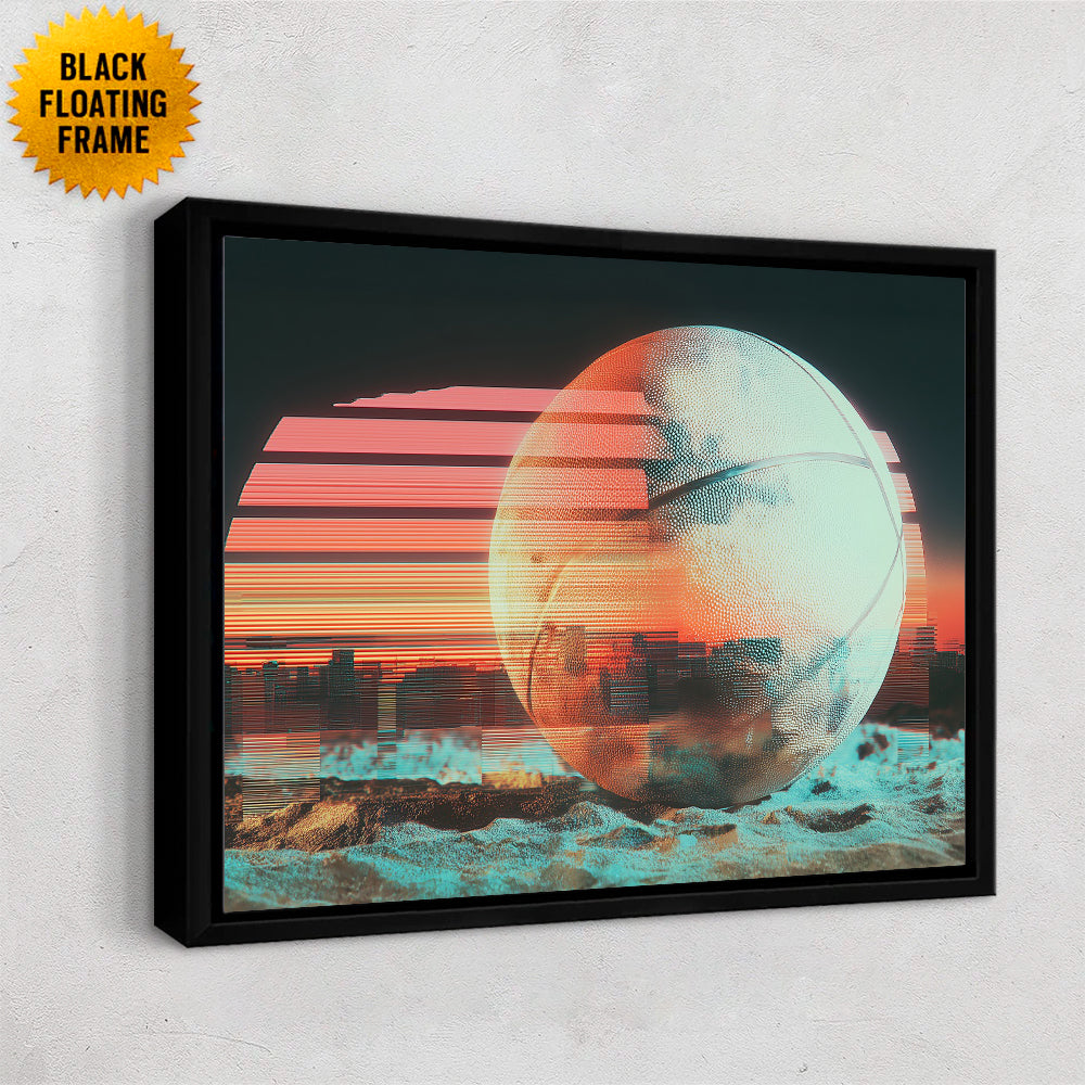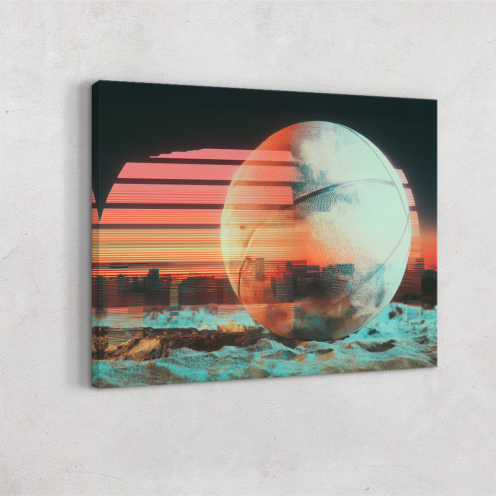 A surreal, futuristic scene shows a colossal basketball resting on a sandy surface at dusk, its scale dwarfing the distant city skyline behind it. Horizontal glitch-like bands slice through the sky and the sphere, blending warm sunset reds with cool teal shadows. The image evokes a sense of altered reality—where sport, landscape, and technology merge—suggesting a moment that exists beyond conventional boundaries.