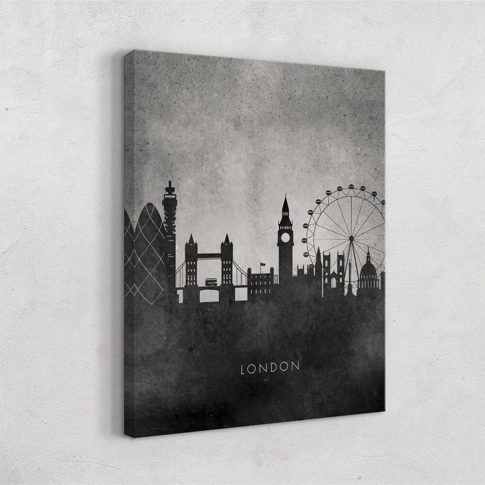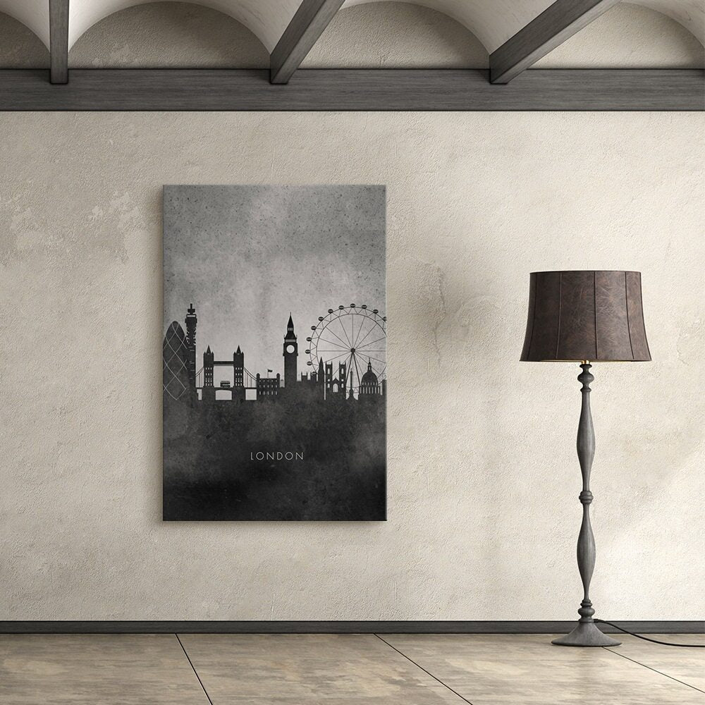 This London skyline piece keeps the vibe clean and modern with a simple black silhouette set against a textured gray background. It highlights the city’s most recognizable landmarks, from the Gherkin and Tower Bridge to Big Ben and the London Eye. The minimalist style makes it easy to blend into any room, while still giving off that classic London charm. It’s a great pick for anyone who loves the city or wants a subtle, design-forward travel print.
