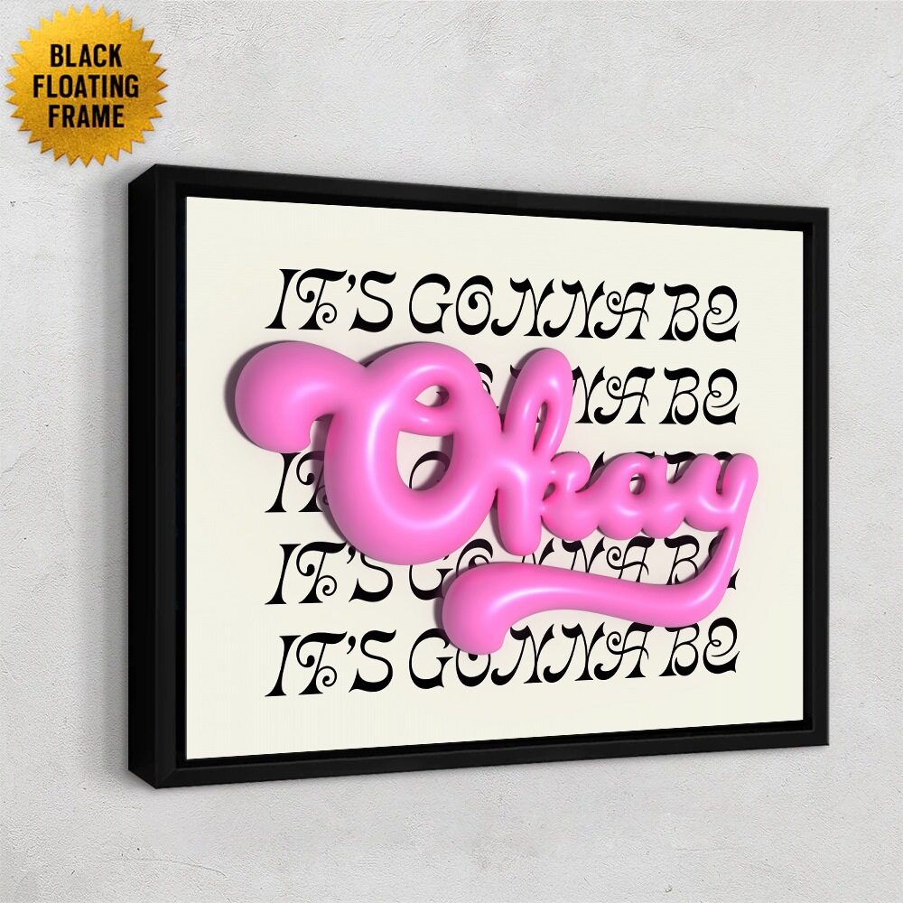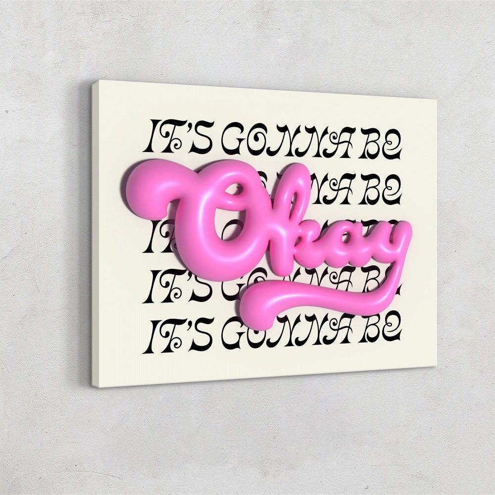 A playful 3D-style pink script word “Okay” appears boldly in the foreground, rendered with a glossy, bubble-like texture that makes it look soft and inflated. Behind it, repeated in a vintage blackletter font, is the phrase “IT’S GONNA BE,” creating a rhythmic, patterned backdrop. The contrast between the bold, modern, candy-like lettering and the ornate blackletter text gives the piece a mix of reassurance and dramatic flair. The overall tone is upbeat, comforting, and visually energetic.