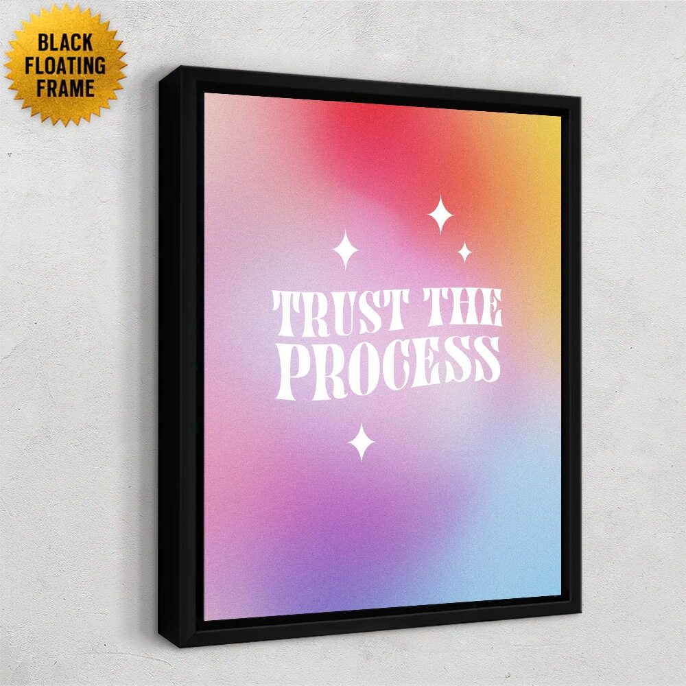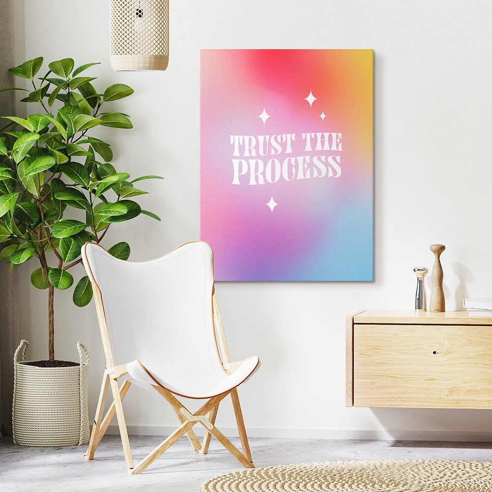 A soft, dreamy gradient washes across this uplifting print, blending warm pinks, sunlit yellows, and calming blues. Centered on the canvas, the phrase Trust the Process appears in bold white vintage-inspired lettering, surrounded by small twinkling star accents. The overall vibe is calm, optimistic, and encouraging, making it a perfect reminder to stay patient and keep moving forward.